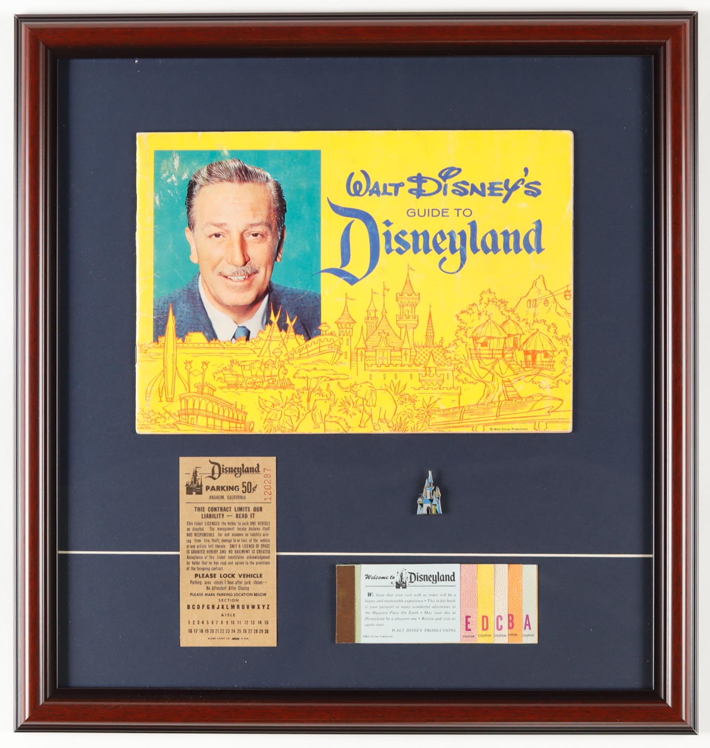 "Walt Disney's Guide to Disneyland" Custom Framed 1963 On-Site Guide Book with Vintage Ticket Book, Parking Pass & Sleeping Beauty's Castle Pin