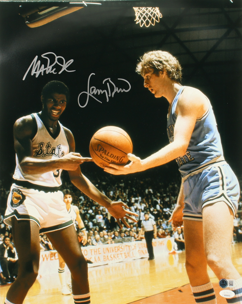 Photo measures 16" x 20" in size and has been hand-signed by Magic Johnson (Michigan State Spartans, HOF) & Larry Bird (Indiana State Sycamores, HOF).