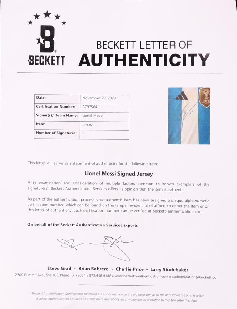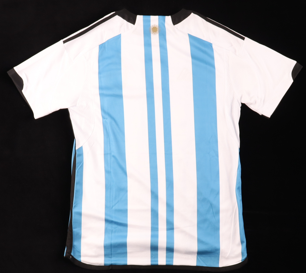 Adidas soccer jersey. Everything pressed on, size L. Hand-signed and inscribed by Lionel Messi.