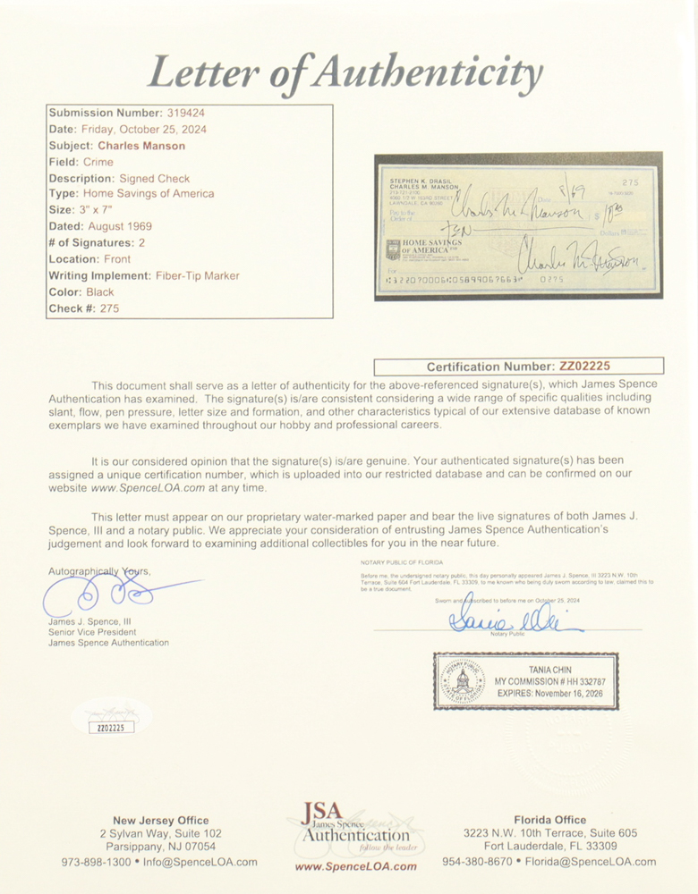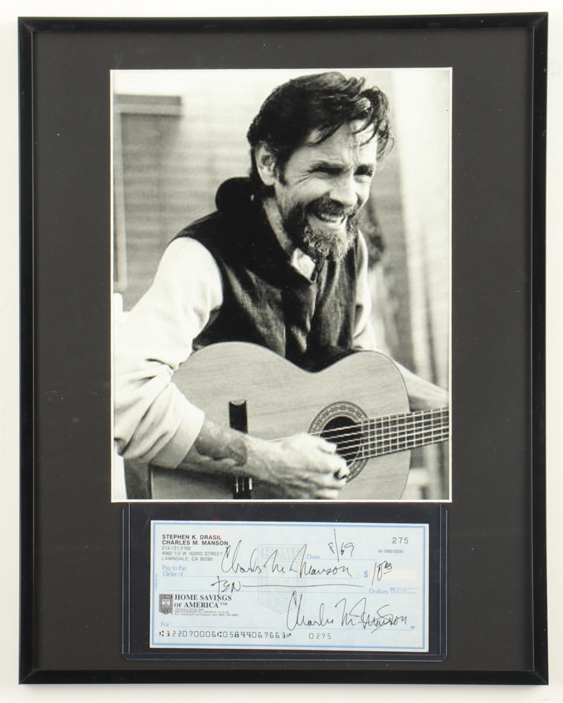 Custom frame measures 11.5" x 14.5" and has a personal check dated August 1969. Hand-signed by Charles Manson (D. 2017).