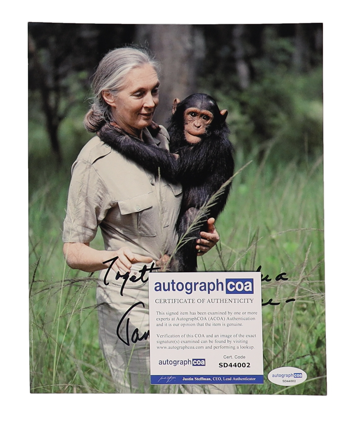 Photo measures 8" x 10" in size. Hand-signed and inscribed by Jane Goodall.