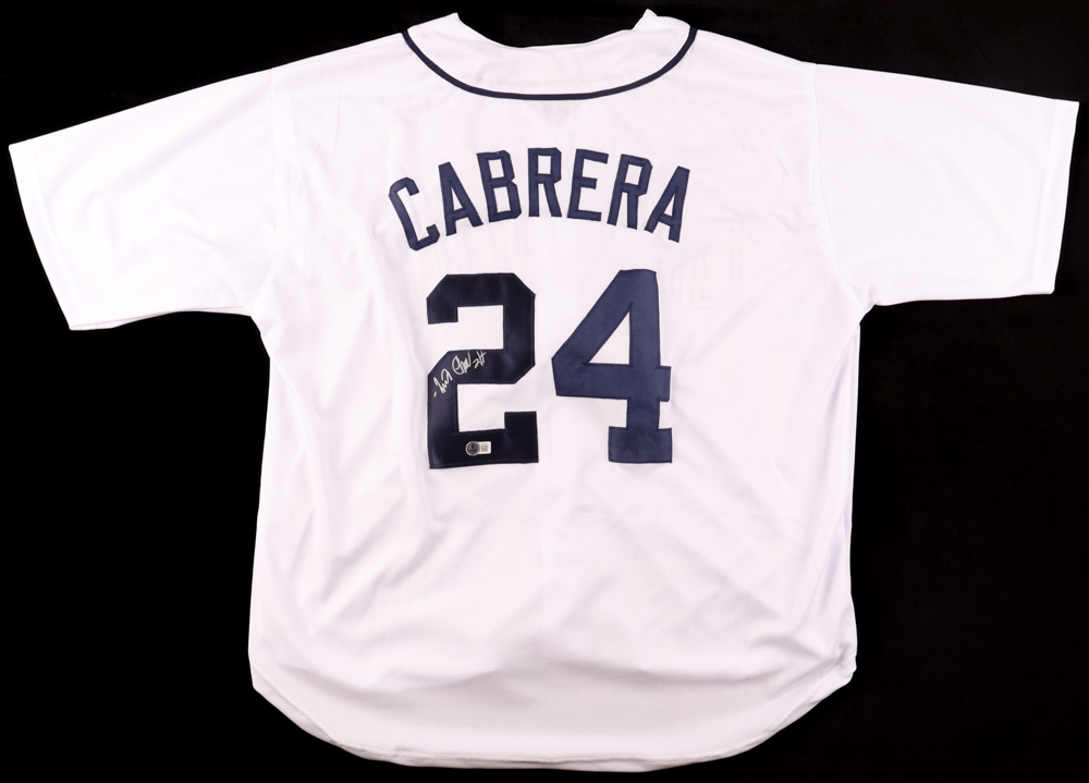 Custom jersey with everything sewn on, size XL. Hand-signed by Miguel Cabrera.