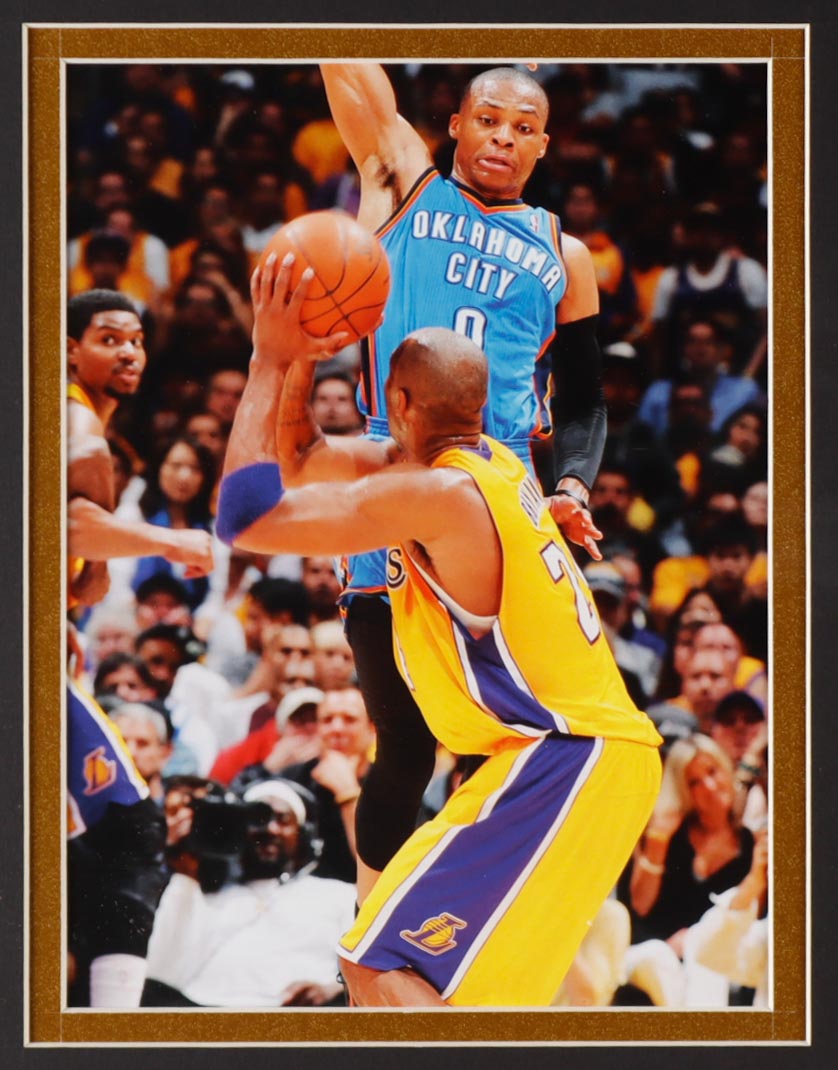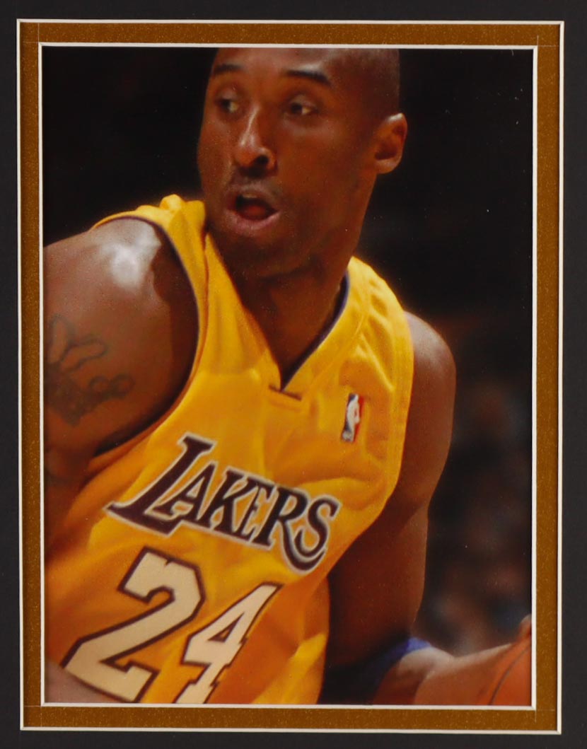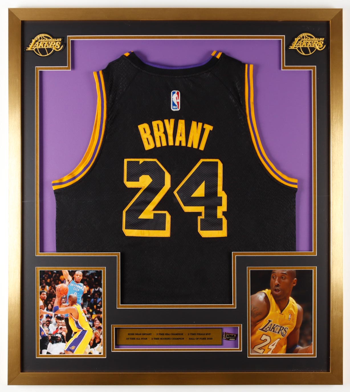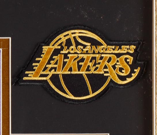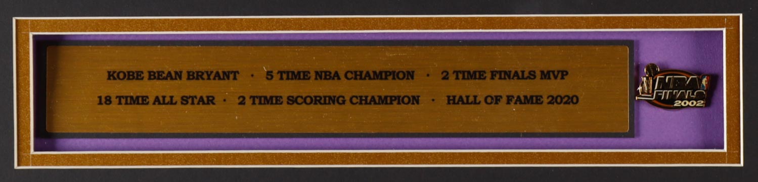 Custom frame measures approximately 32" x 36" in size and features an unsigned Kobe Bryant (D. 2020) jersey. This display also includes a 2002 NBA Finals Pin and (2) cloth team logo patches. Please note, the display is unsigned.