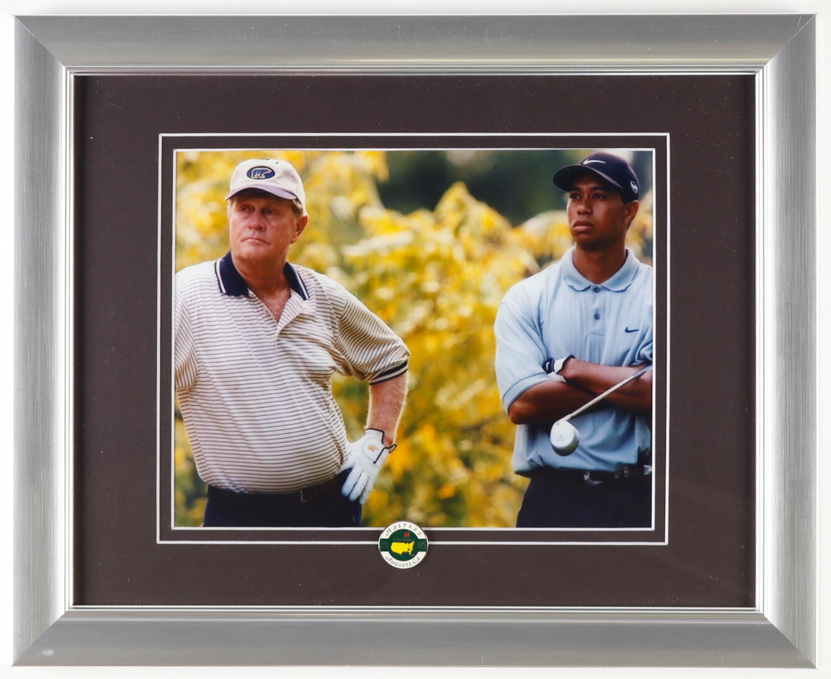 Jack Nicklaus & Tiger Woods Custom Framed Photo Display With 2005 Augusta Masters Tournament Pin
