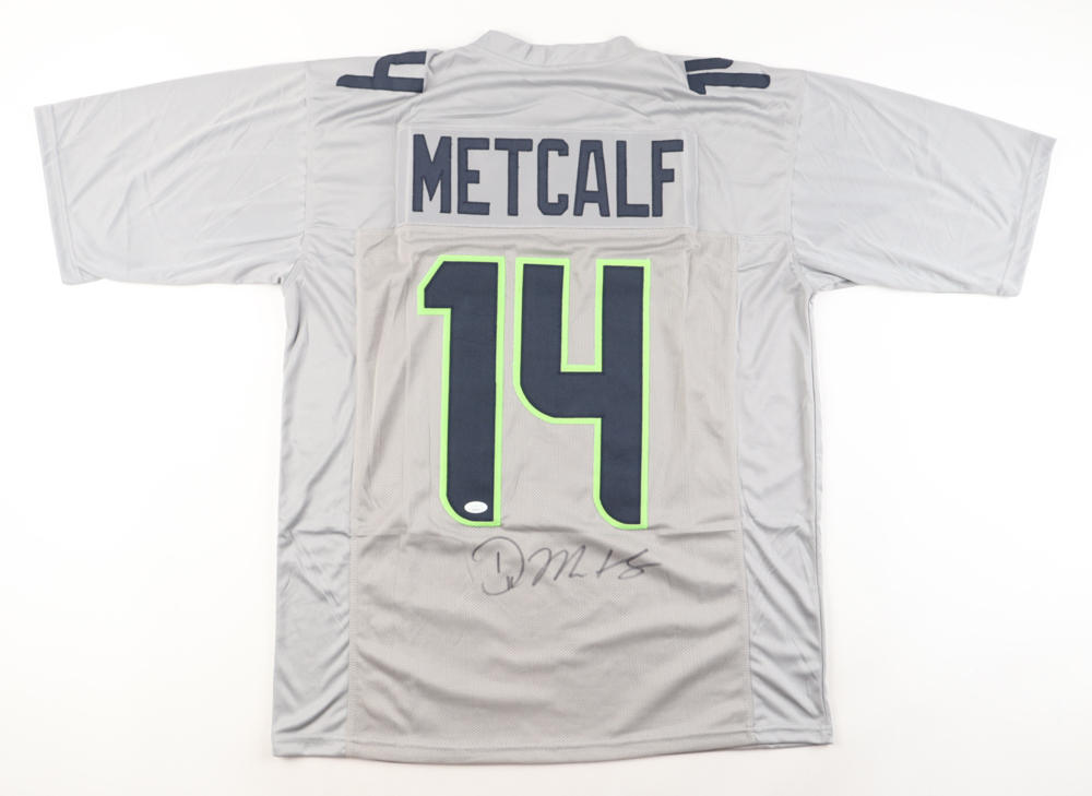 Custom jersey with everything sewn on, size XL. Hand-signed by DK Metcalf.