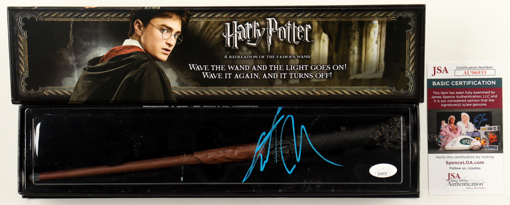 Toy wand has been hand-signed on the original packaging by Daniel Radcliffe. Please note, the autograph is partially smudged and there are other scuffs to the packaging, see photos for more details.