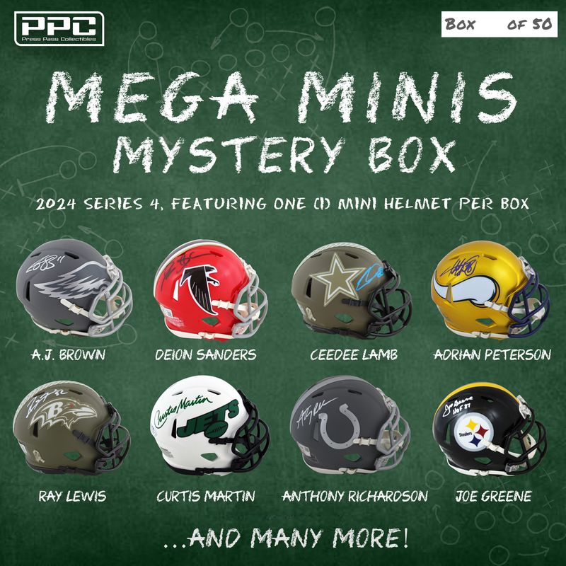 The Press Pass Collectibles 2024 mega mini helmet mystery box includes one (1) mini helmet from your favorite NFL teams. Some boxes will feature mini helmets signed Ray Lewis, Curtis Martin, Anthony Richardson, Joe Greene, and many more!