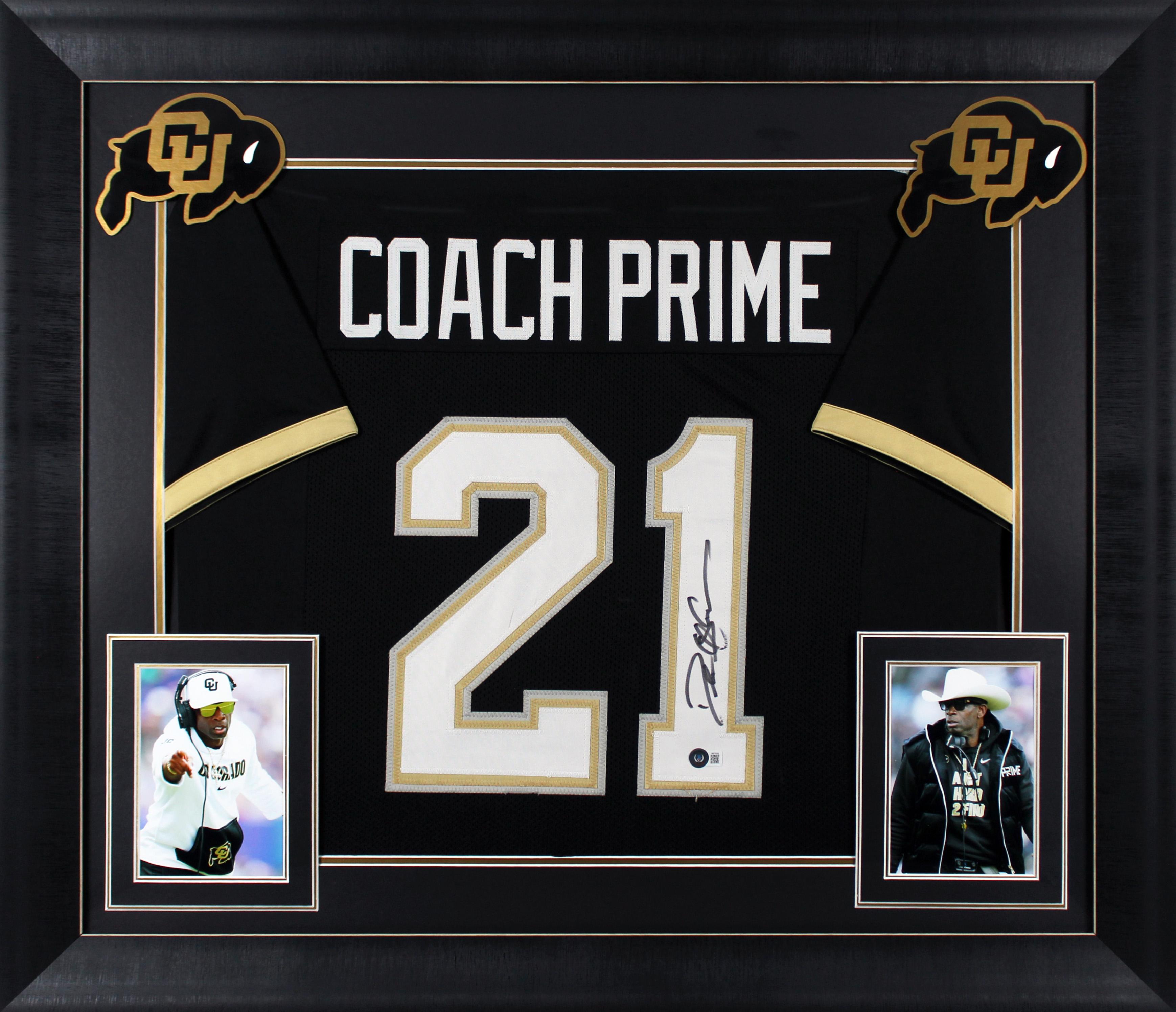 Custom frame measures 32" x 37" in size and features a jersey that has been hand signed by Deion Sanders (HOF).