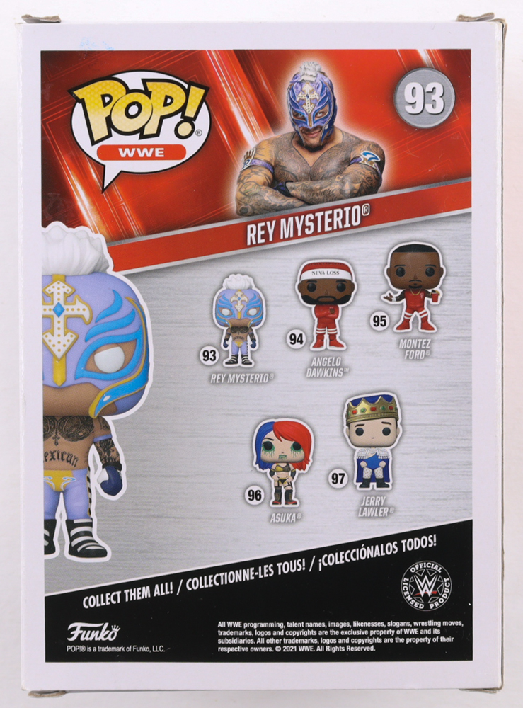 Funko Pop! vinyl figure that measures approximately 4" tall in size and has been hand-signed by Rey Mysterio (HOF). Please note, minor tears on the corners of the packaging.