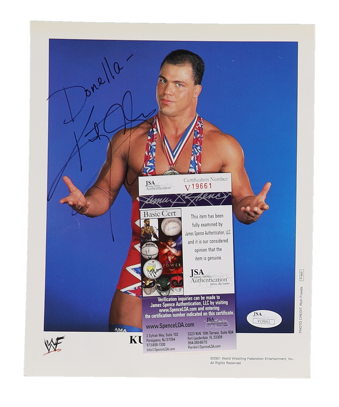Photo measures 8" x 10" in size and has been hand-signed by Kurt Angle (HOF). Please note, photo has been personalized to "Donella".