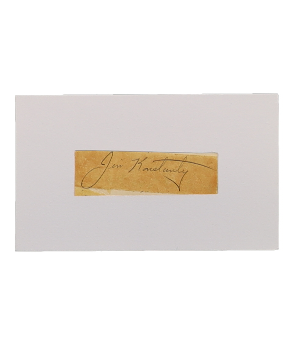 Cut on 3" x 5" index card has been hand-signed by Jim Konstanty (D. 1976, Philadelphia Phillies).