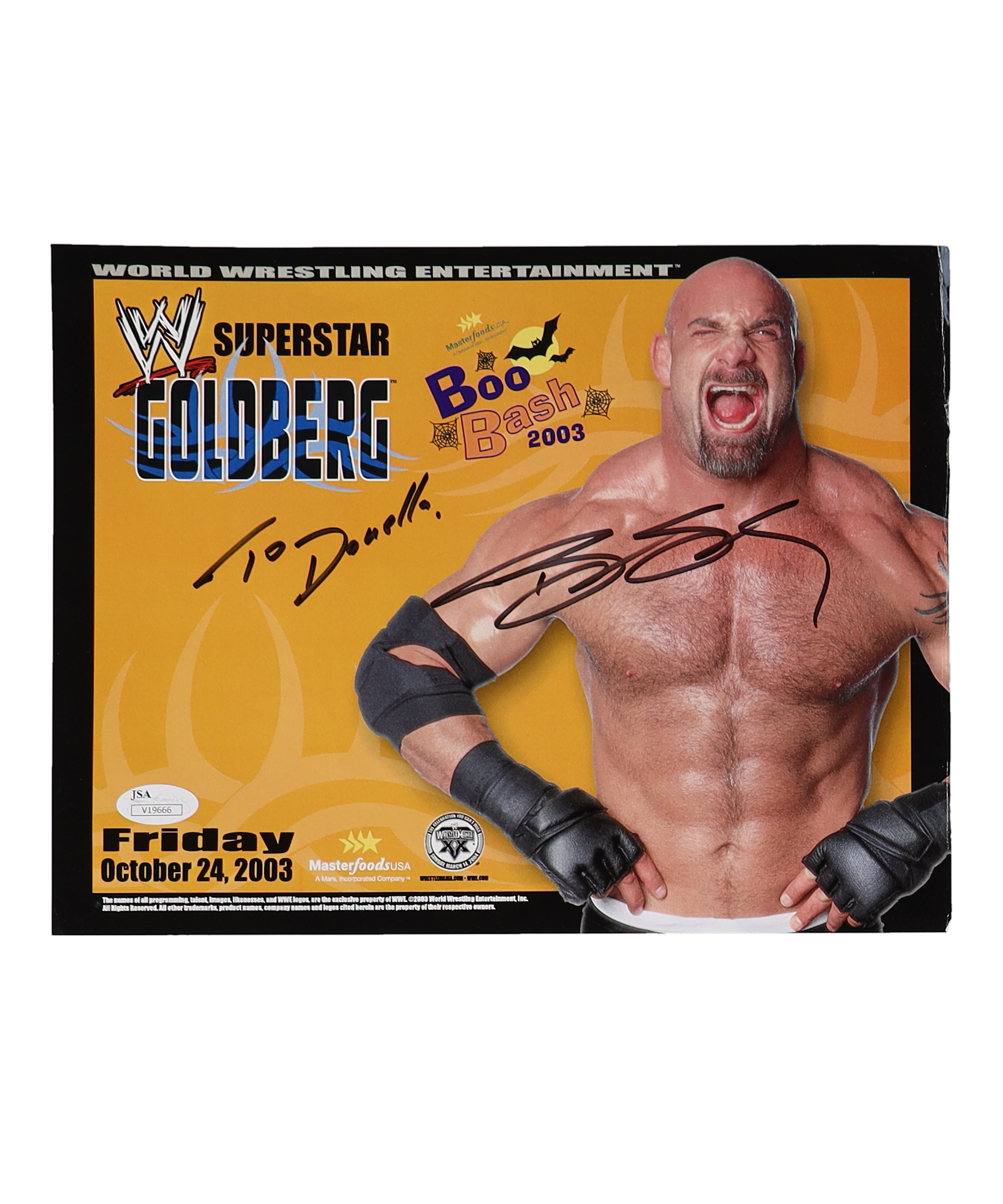 Photo measures 8" x 10" in size and has been hand-signed by Bill Goldberg (HOF). Please note, the photo has been personalized to "Donella" and minor creasing on the corners of the photo..