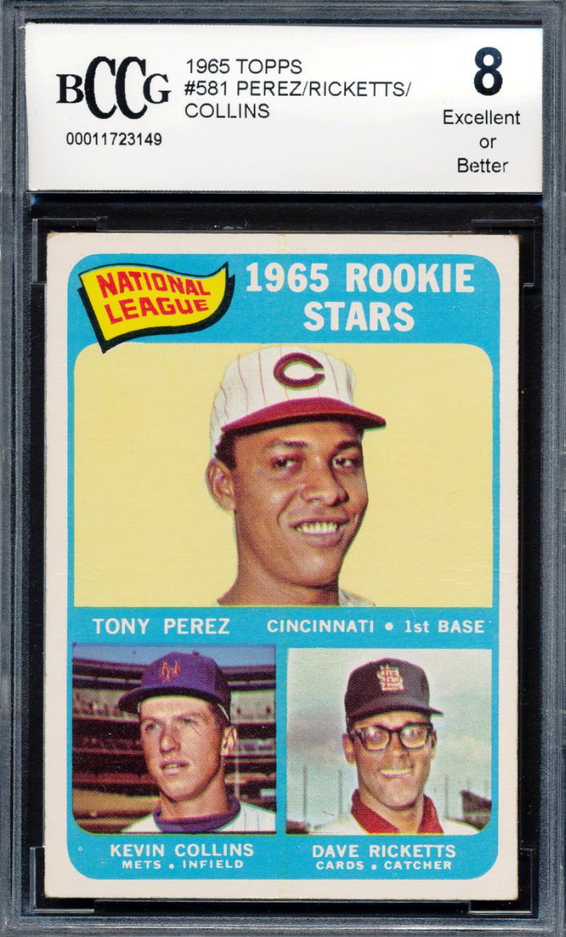 Tony Perez RC / Dave Ricketts RC / Kevin Collins RC SP 1965 Topps Rookie Stars #581 (BCCG 8)