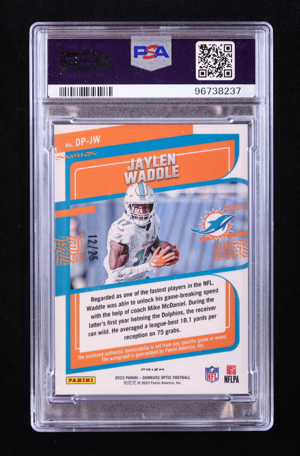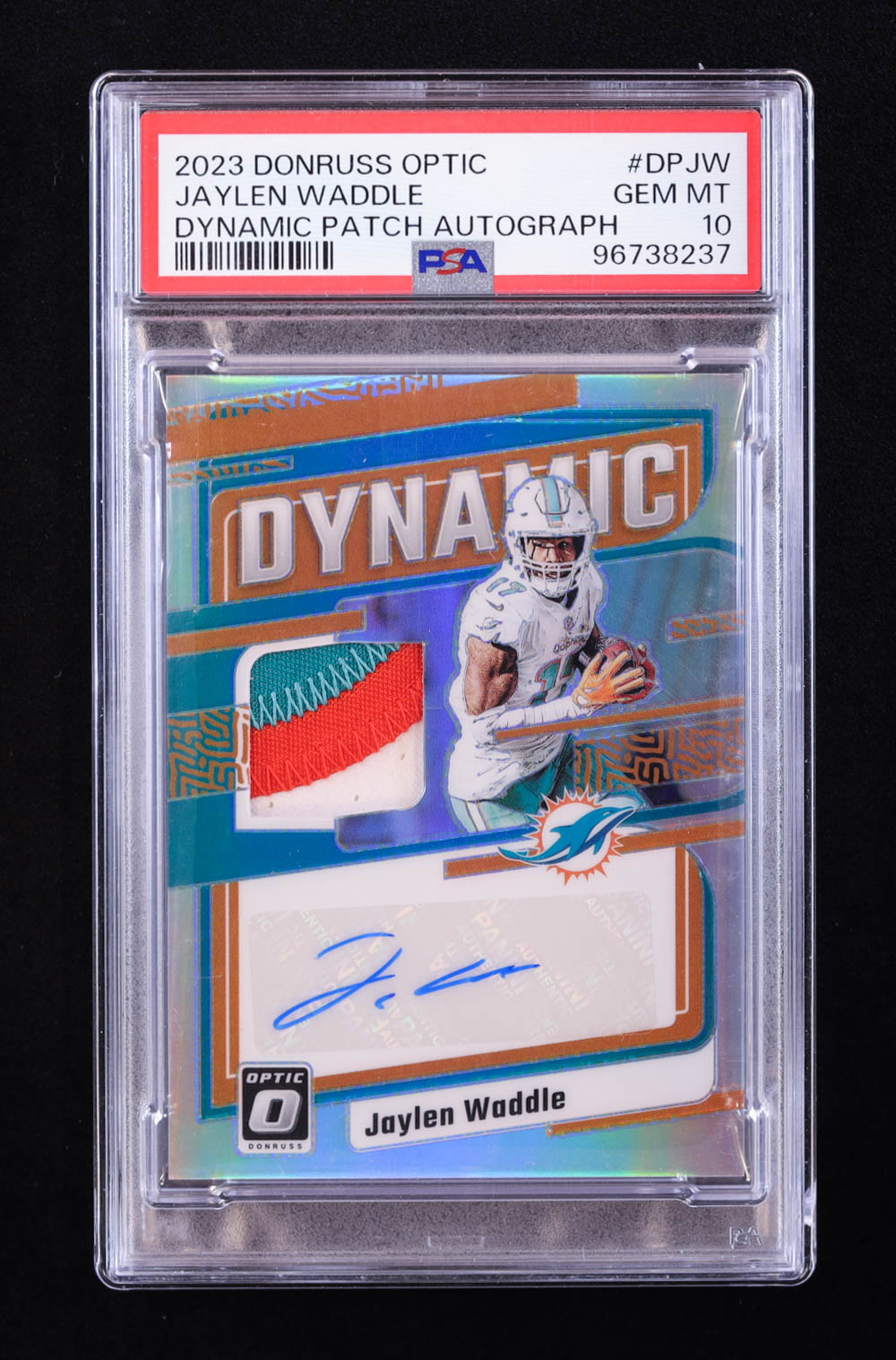 Jaylen Waddle 2023 Donruss Optic Dynamic Patch Autographs #21 #12/25 (PSA 10)