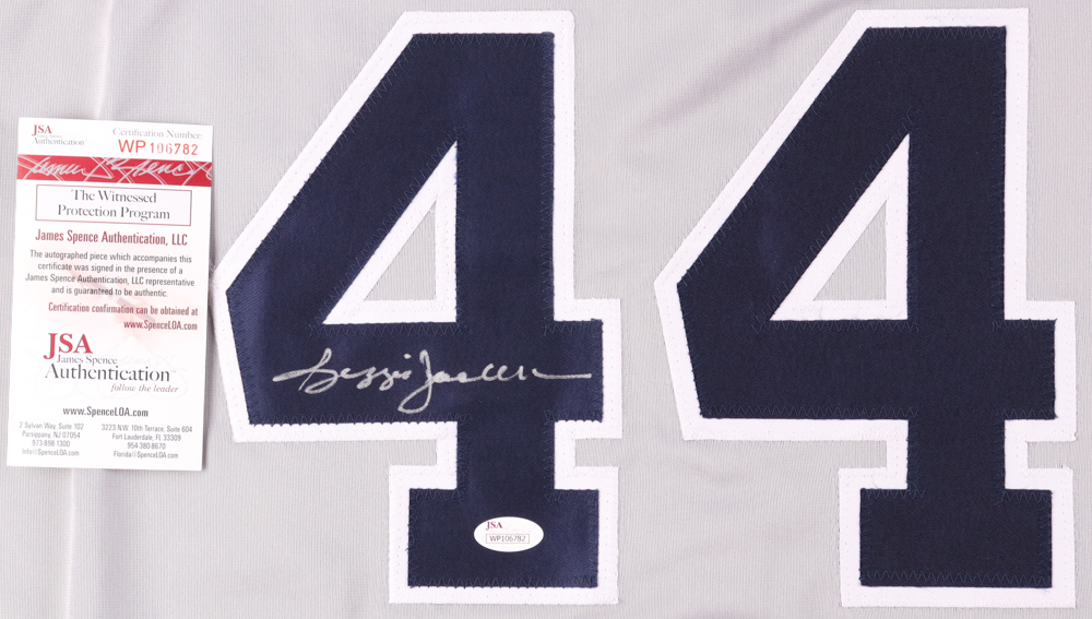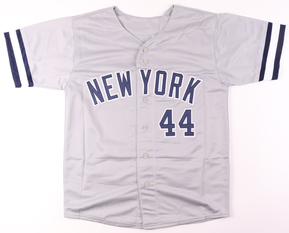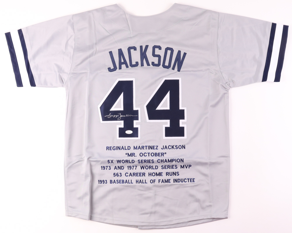Custom on-field style jersey. Everything is sewn on, size XL. Hand-signed by Reggie Jackson (HOF). Jackson's career statistics have been custom stitched onto the back of the jersey below the reverse numbers.