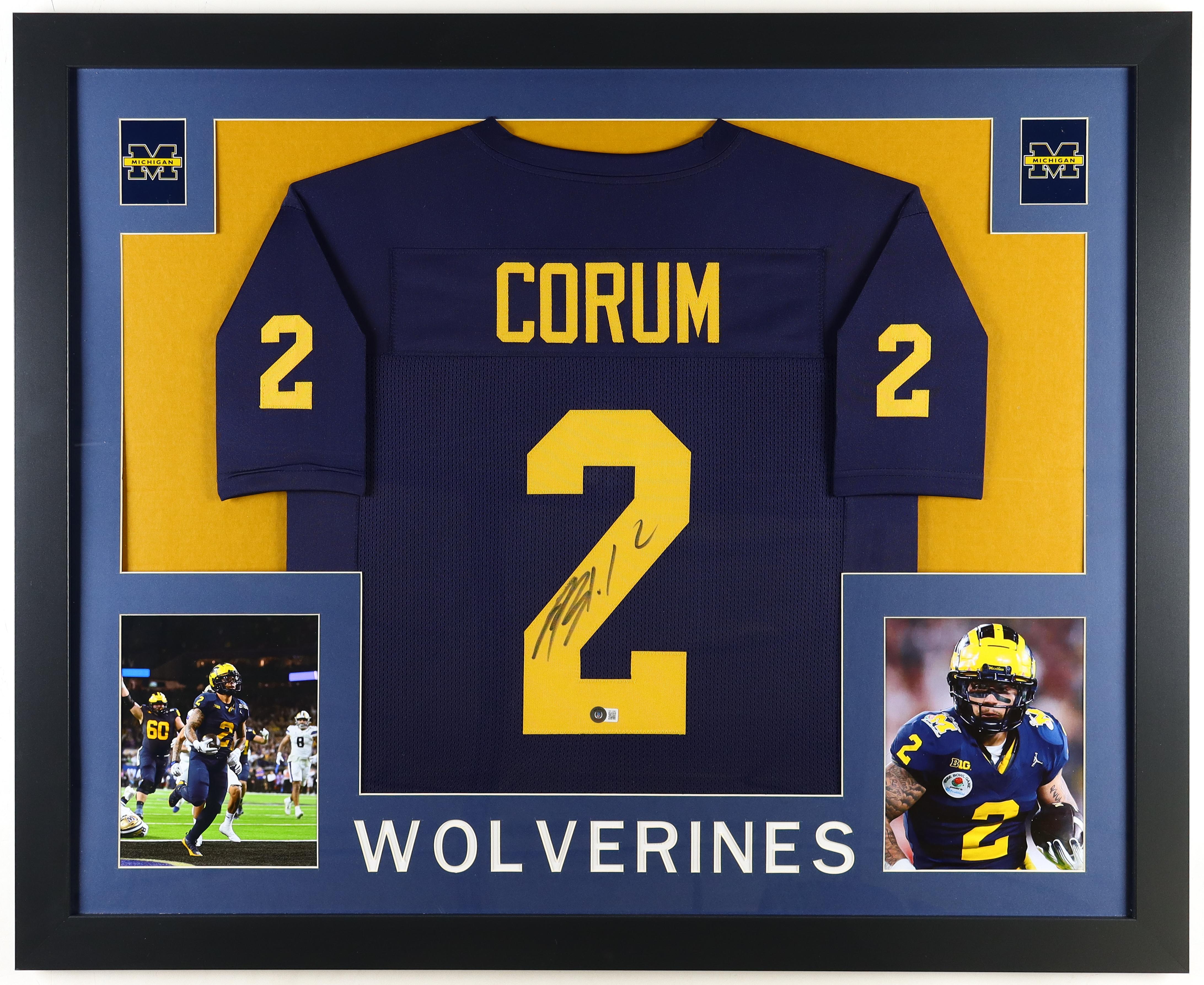 Custom frame measures approximately 34" x 42" in size and features a jersey hand-signed by Blake Corum. The display also includes (2) 8" x 10" photos. Please note that the 8" x 10" photos may be in different order.
