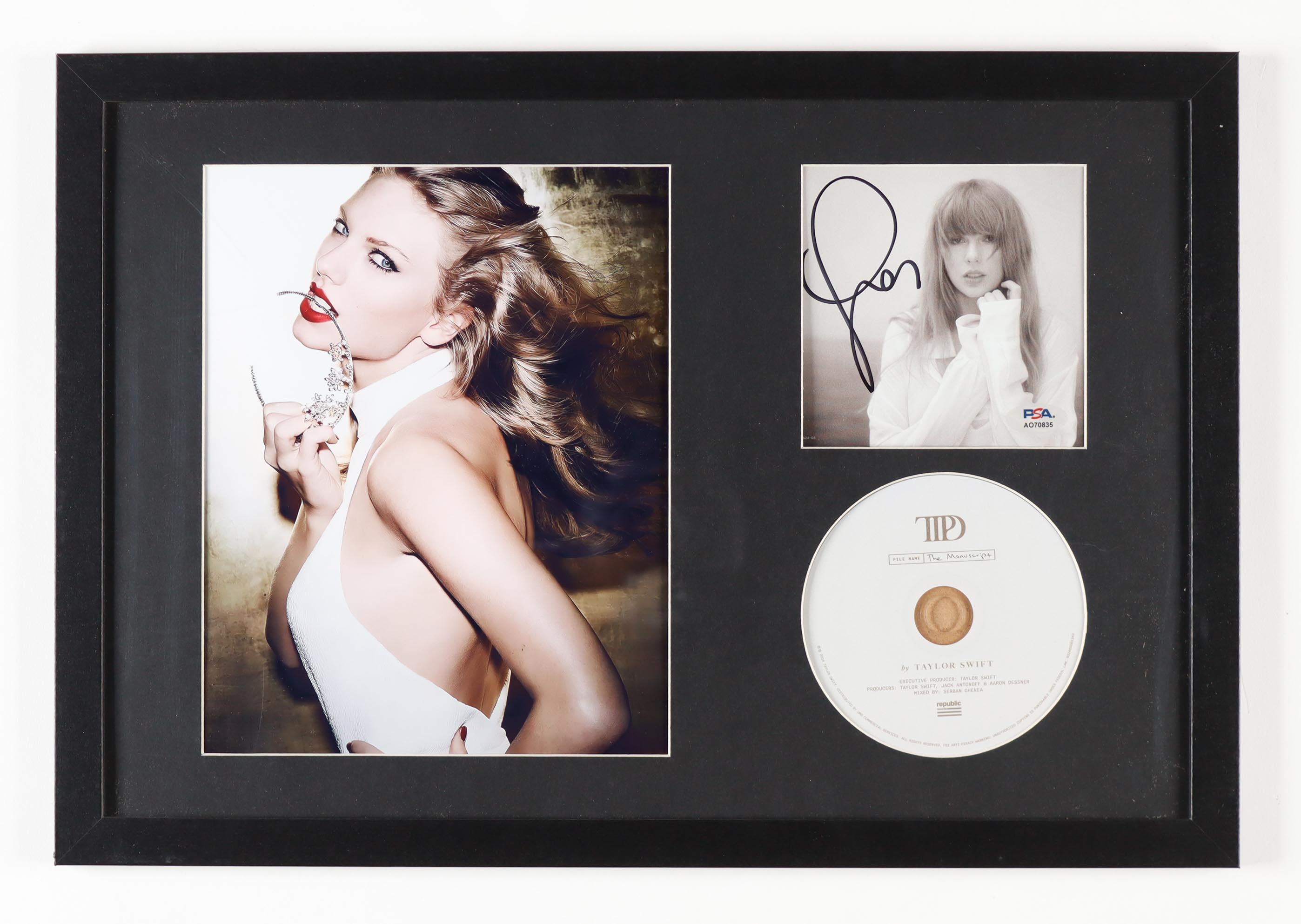 Custom frame measures approximately 13" x 19" in size. Features a "The Torture Poets Department" CD insert that has been hand-signed by Taylor Swift. The display also includes the disc as shown.