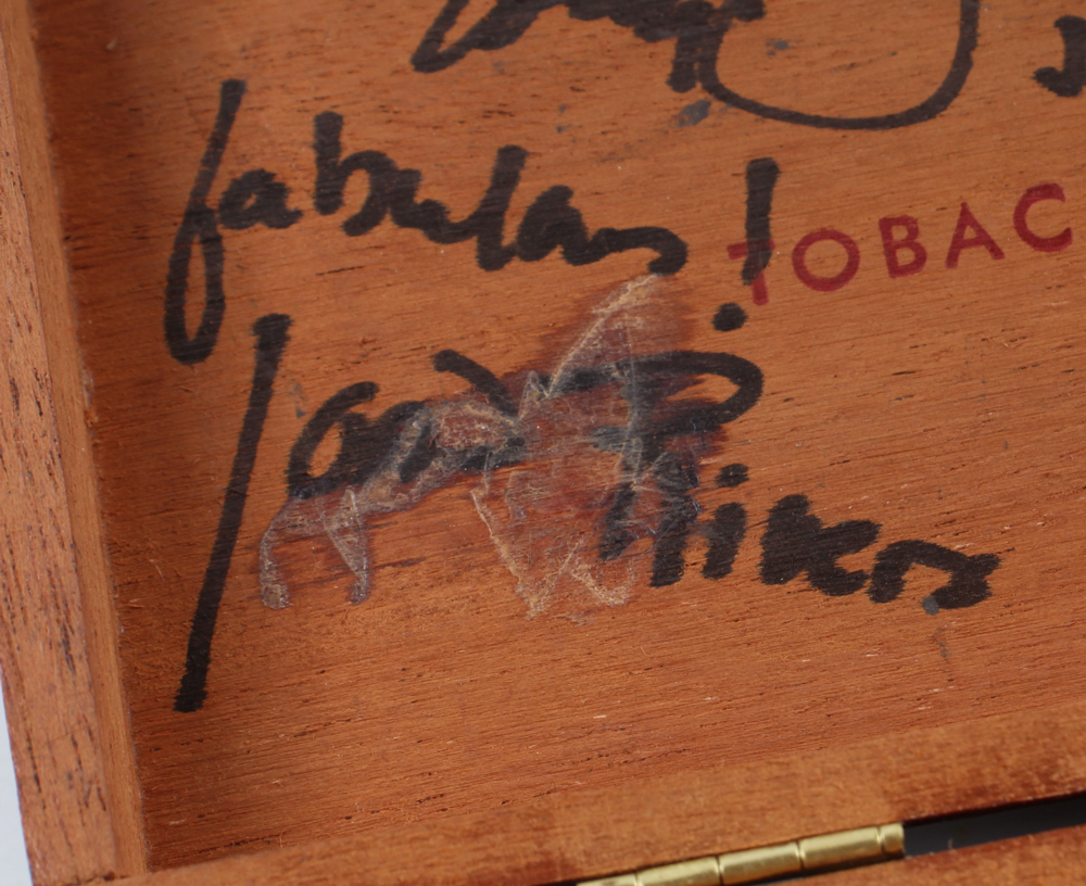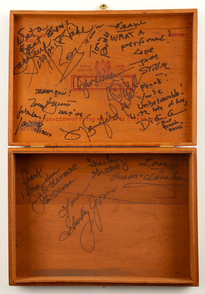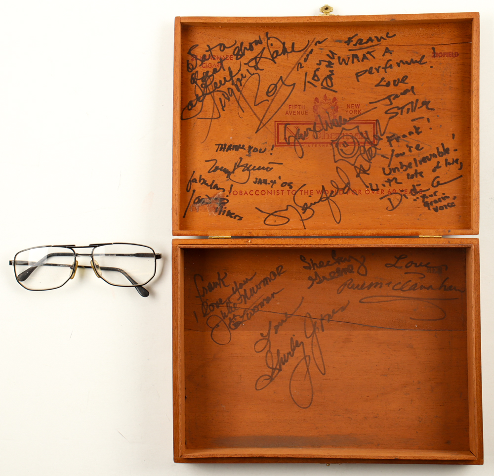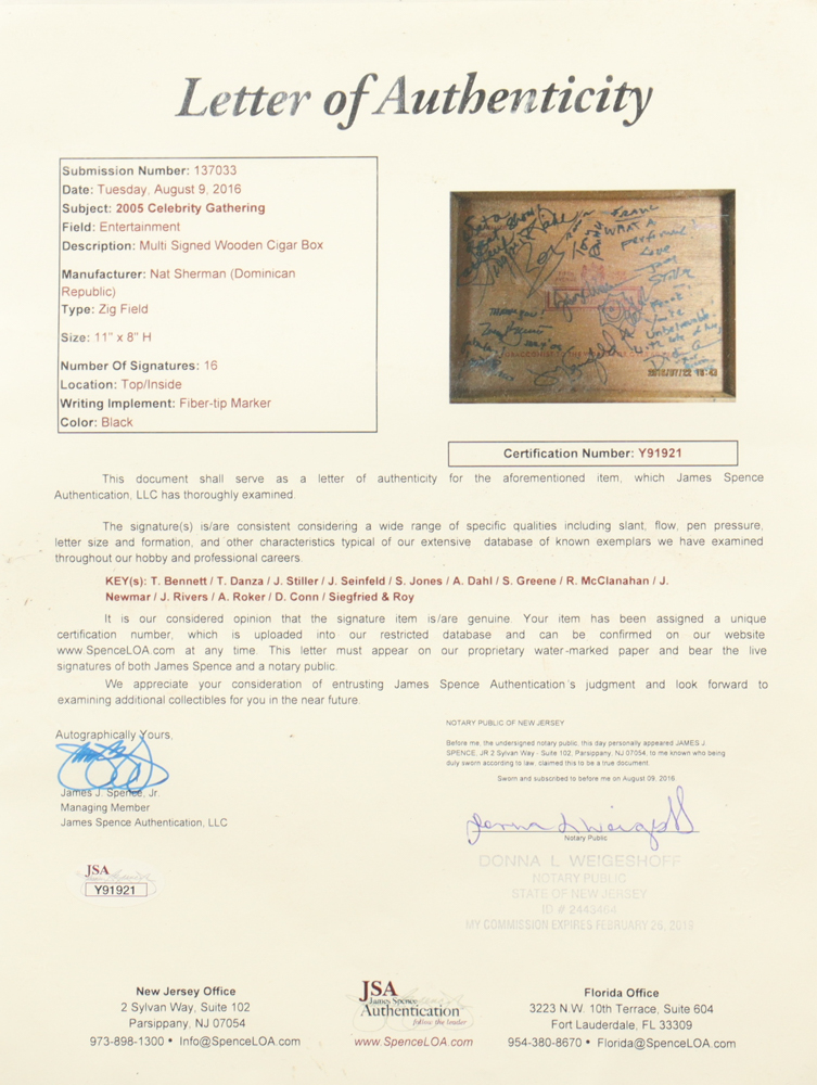 "2005 Celebrity Gathering" Nat Sherman Cigar Box With Eye Glasses measures approximately 8" x 11" x 2" in dimension and has been hand-signed and inscribed by (16) with Tony Bennett, Jerry Stiller, Jerry Seinfeld, Siegfried & Roy, Shirley Jones, Julie Newmar, Joan Rivers, Tony Danza, Al Roker, Rue McClanahan, Shecky Greene and (4) others. Please note, the cigar box has cracks, staining and scuffing and the eye glasses have scratches.