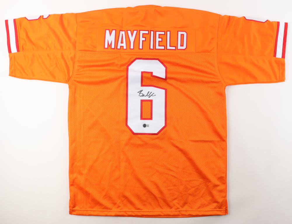 Custom jersey with everything sewn on, size XL. Hand-signed by Baker Mayfield.