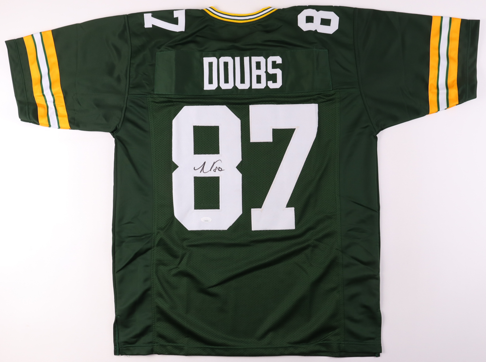 Custom jersey. Everything is sewn on, size XL. Hand-signed by Romeo Doubs.