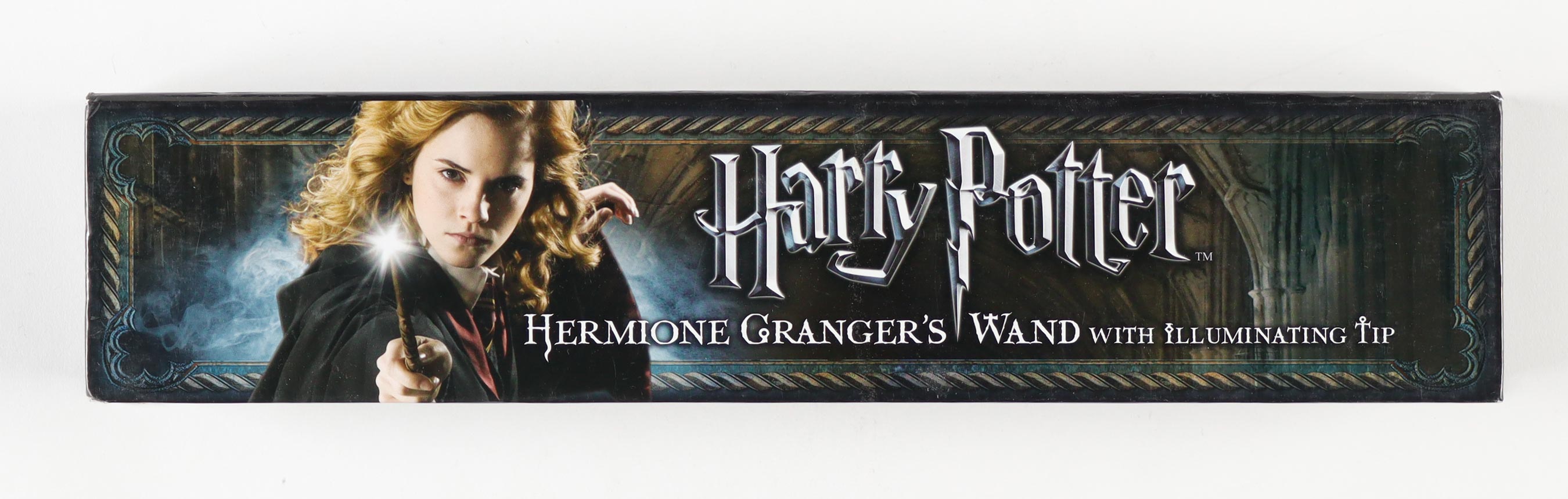 Hermione Granger "Harry Potter" Wand With Illuminating Tip With Original Box. Please note, the wand is unsigned and there is some scuffing and corner and edge wear on the packaging.