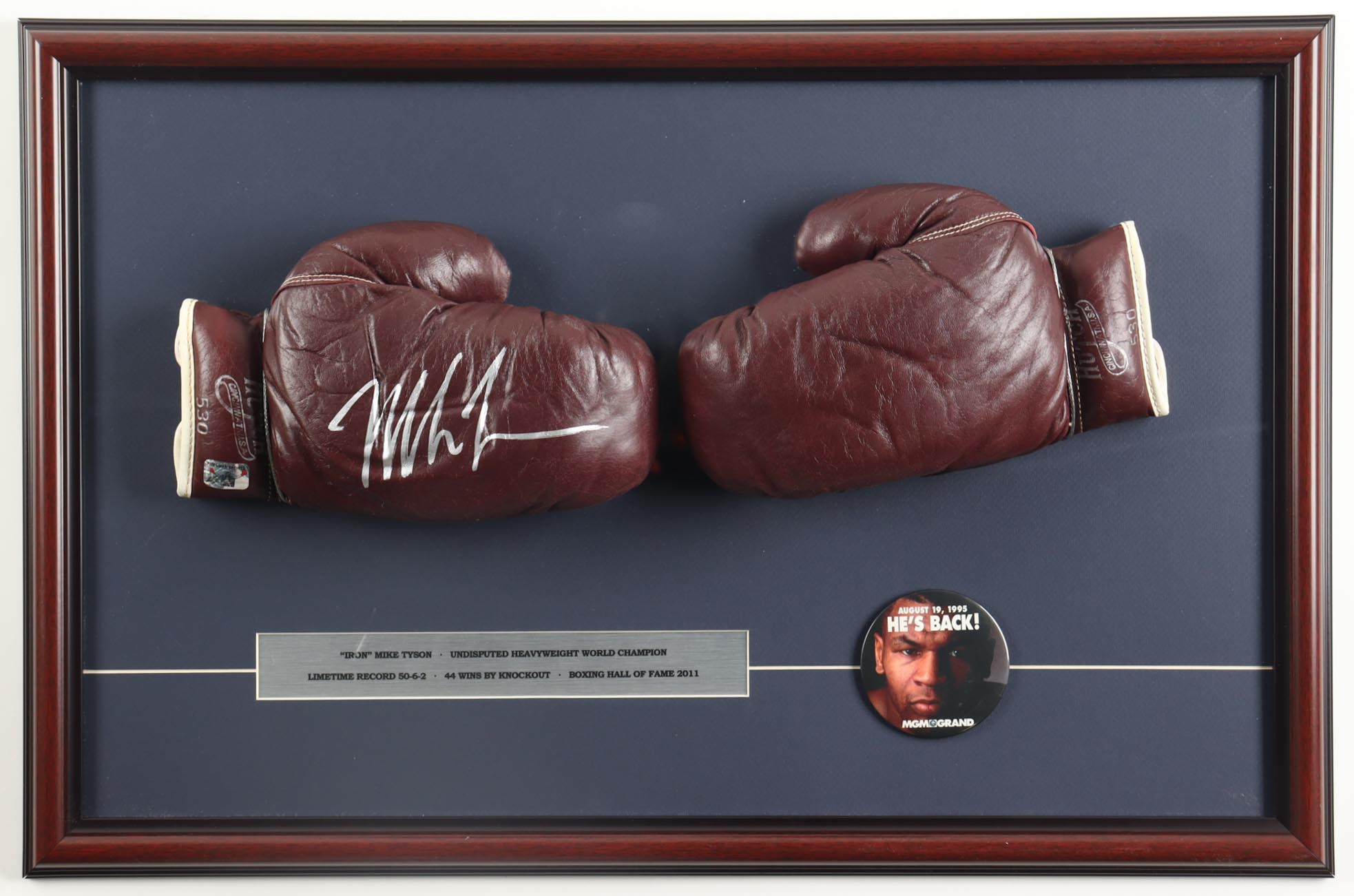 Custom frame measures approximately 17" x 26" in size and features a set of (2) Vintage Burgundy Hutch Leather Boxing Gloves, left glove has been hand-signed by Mike Tyson (HOF). The display also includes a MGM Grand "He's Back" Pin