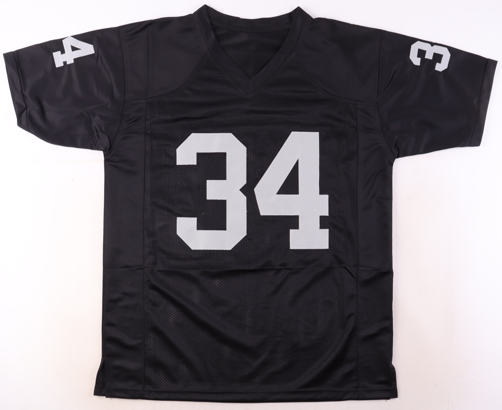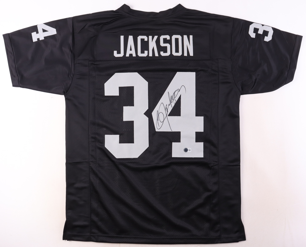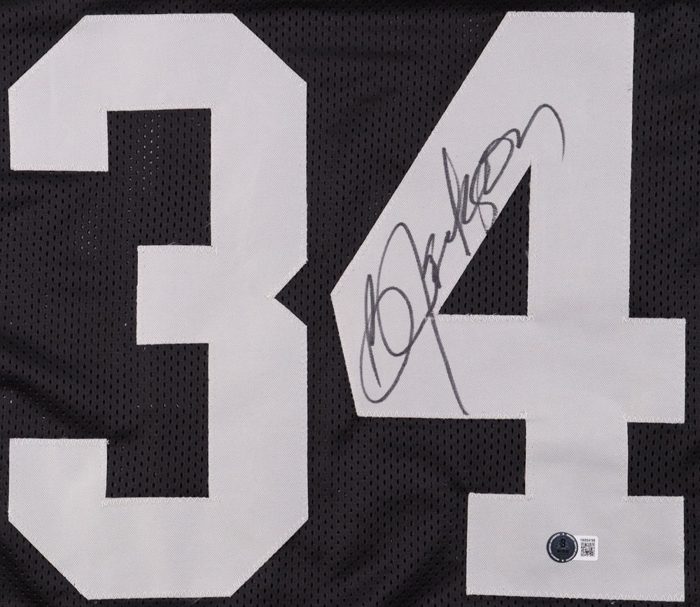 Custom jersey with everything sewn on, size XL. Hand-signed by Bo Jackson.