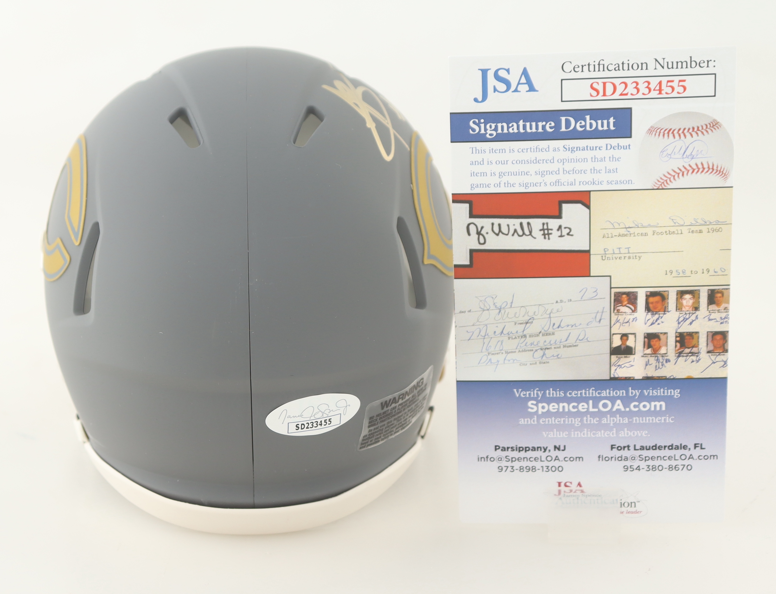 The autograph(s) includes an official James Spence Authentication (JSA) "Signature Debut" hologram and COA. "Signature Debut" is the autographed memorabilia equivalent to a rookie card. The JSA definition of a "Signature Debut" is as follows: "Any item that is autographed and received by JSA prior to the last game of the signer's official rookie season.