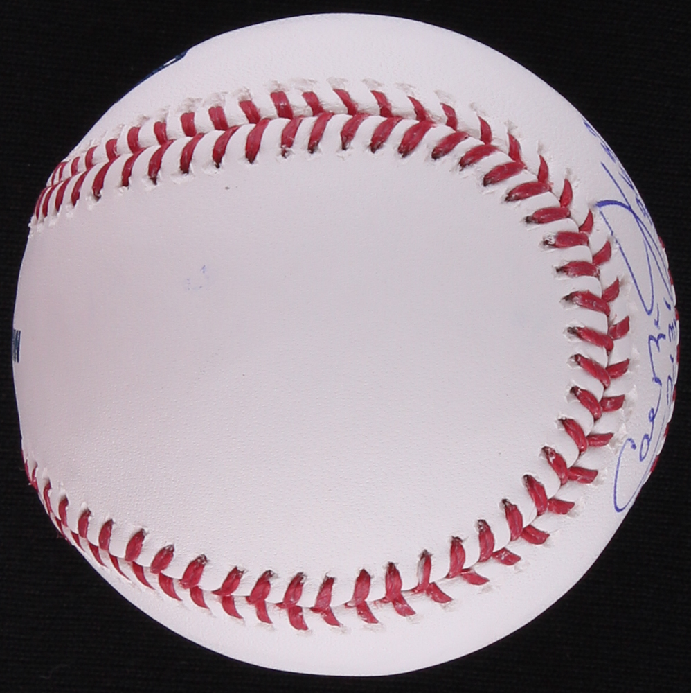Rawlings Official Major League Baseball has been hand-signed and inscribed in blue ink pen by Cal Ripken Jr. (Orioles, HOF). Please note, there is minor staining on the ball.