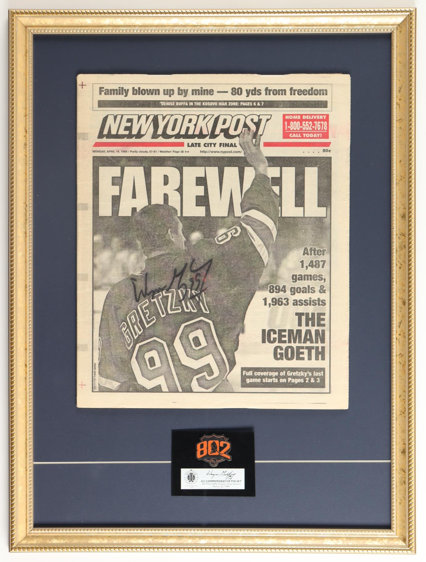 Custom frame measures approximately 18" x 24" in size and features a "New York Post" newspaper that has been hand-signed by Wayne Gretzky (New York Rangers, HOF). The display also includes a Limited Edition #/2500 Upper Deck 802 Career Goal Commemorative Stat Pin.