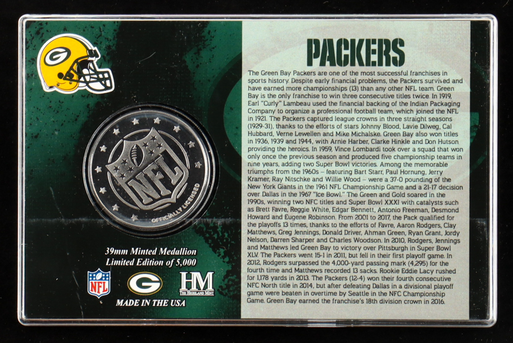 Green Bay Packers Highland Mint 39mm Medallion in Capsule. Original packaging is sealed and included as shown. Please see photos for details regarding the condition of the ornament.
