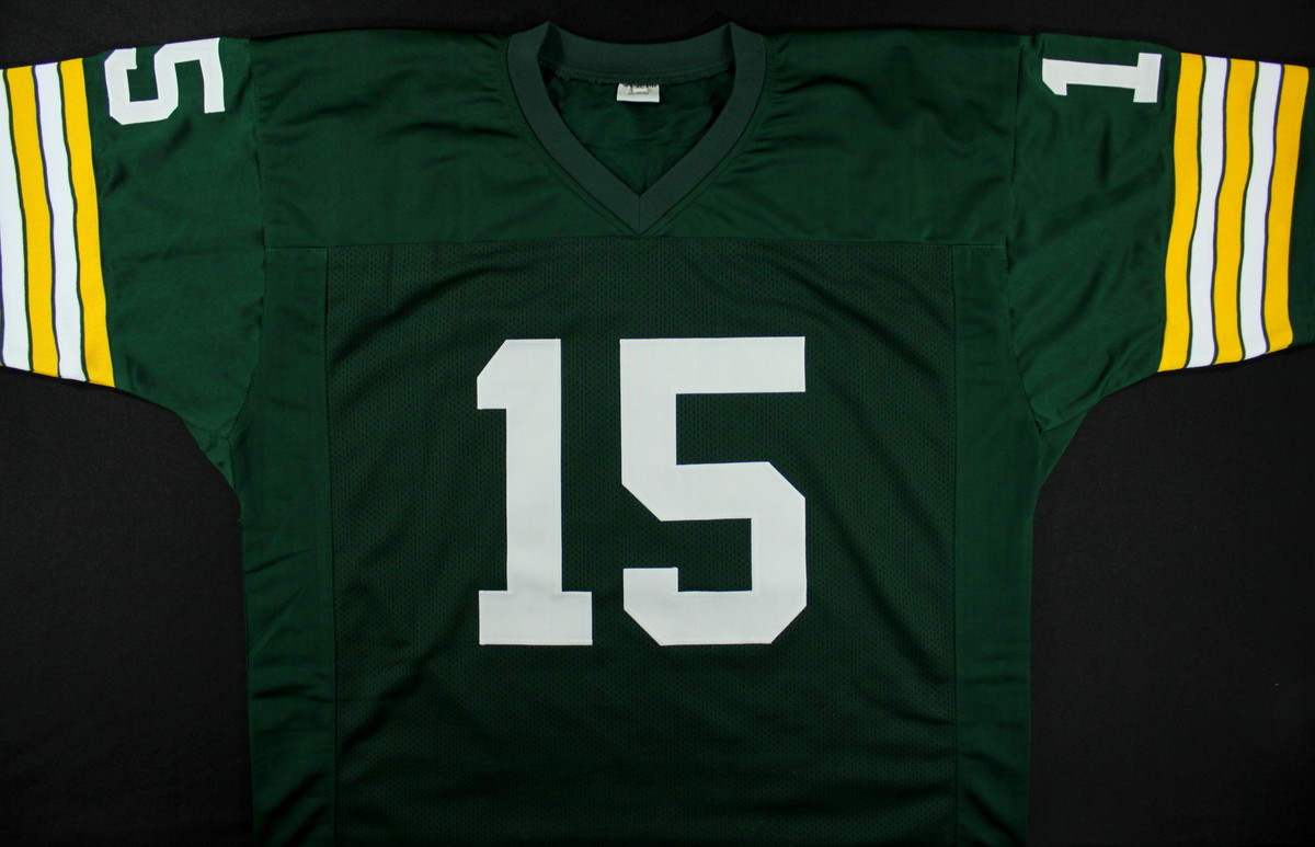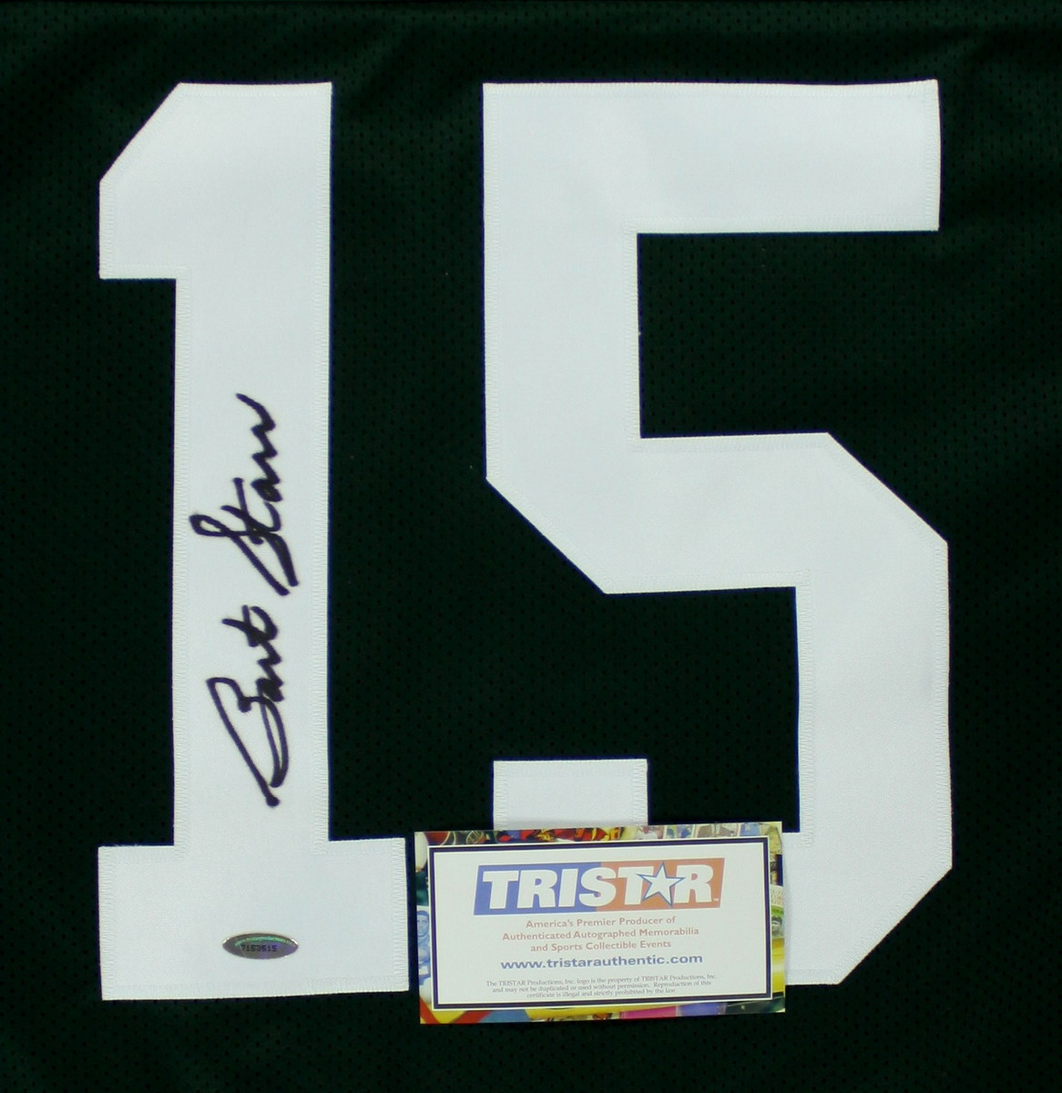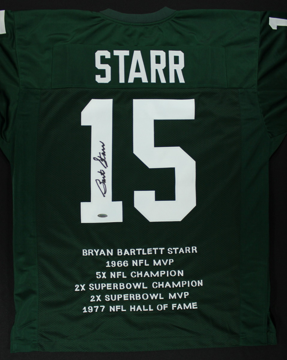 On-field style jersey. Everything is sewn on, size XL. Hand-signed in black felt tip pen by Bart Starr. Starr's career stats are custom stitched into the jersey below the reverse numbers. Autograph includes an official TriStar Hologram and COA for authenticity purposes.