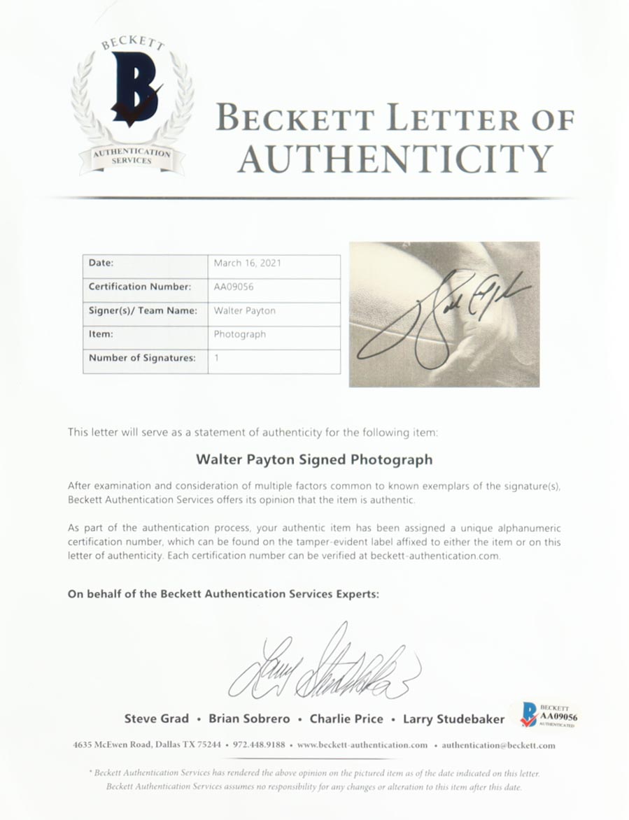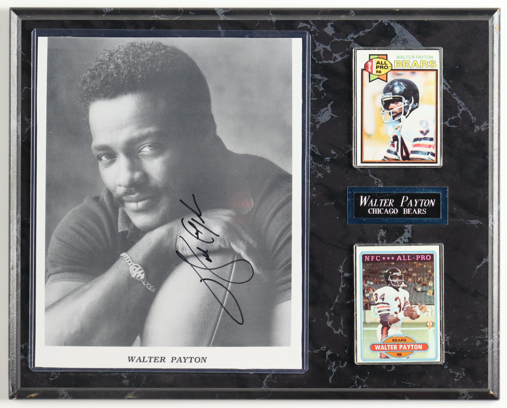 Custom display measures approximately 12" x 15" in size and features a photo that has been hand-signed by Walter Payton (D. 1999, Chicago Bears, HOF). The display also includes 1980 Topps All-Pro #160 and 1979 Topps #480 Trading Cards. Please note, the cards are unsigned and the plaque has chipping on the corners.