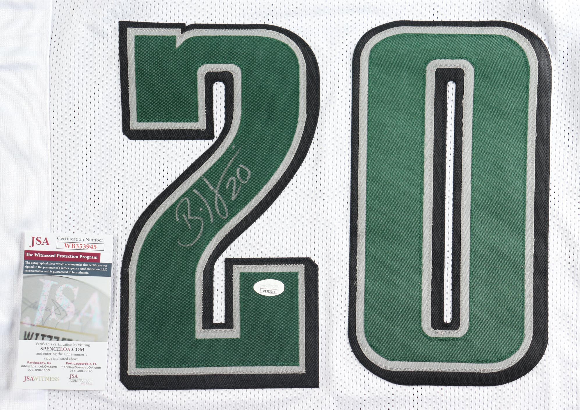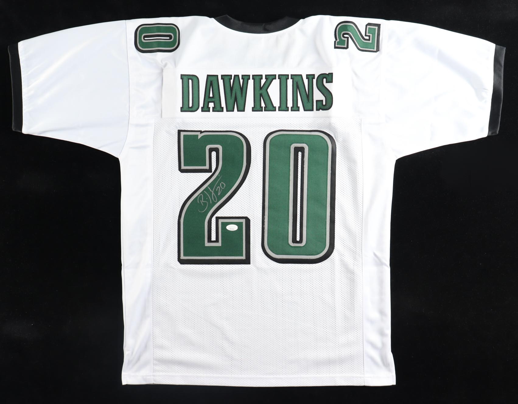 Custom jersey with everything sewn on, size XL. Hand-signed by Brian Dawkins (HOF).