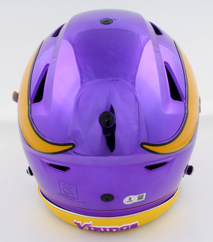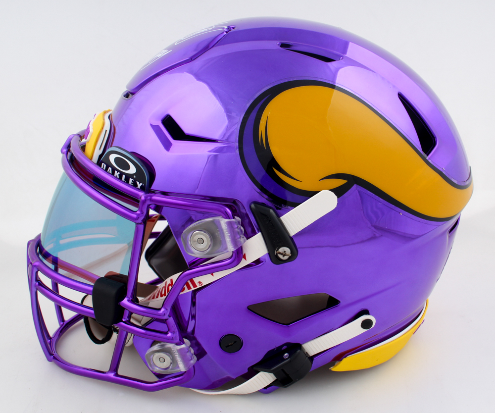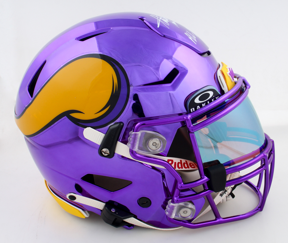 Riddell Minnesota Vikings Full-Size Authentic On-Field Chrome Speedflex Helmet with visor. Hand-signed and inscribed by Adrian Peterson.
