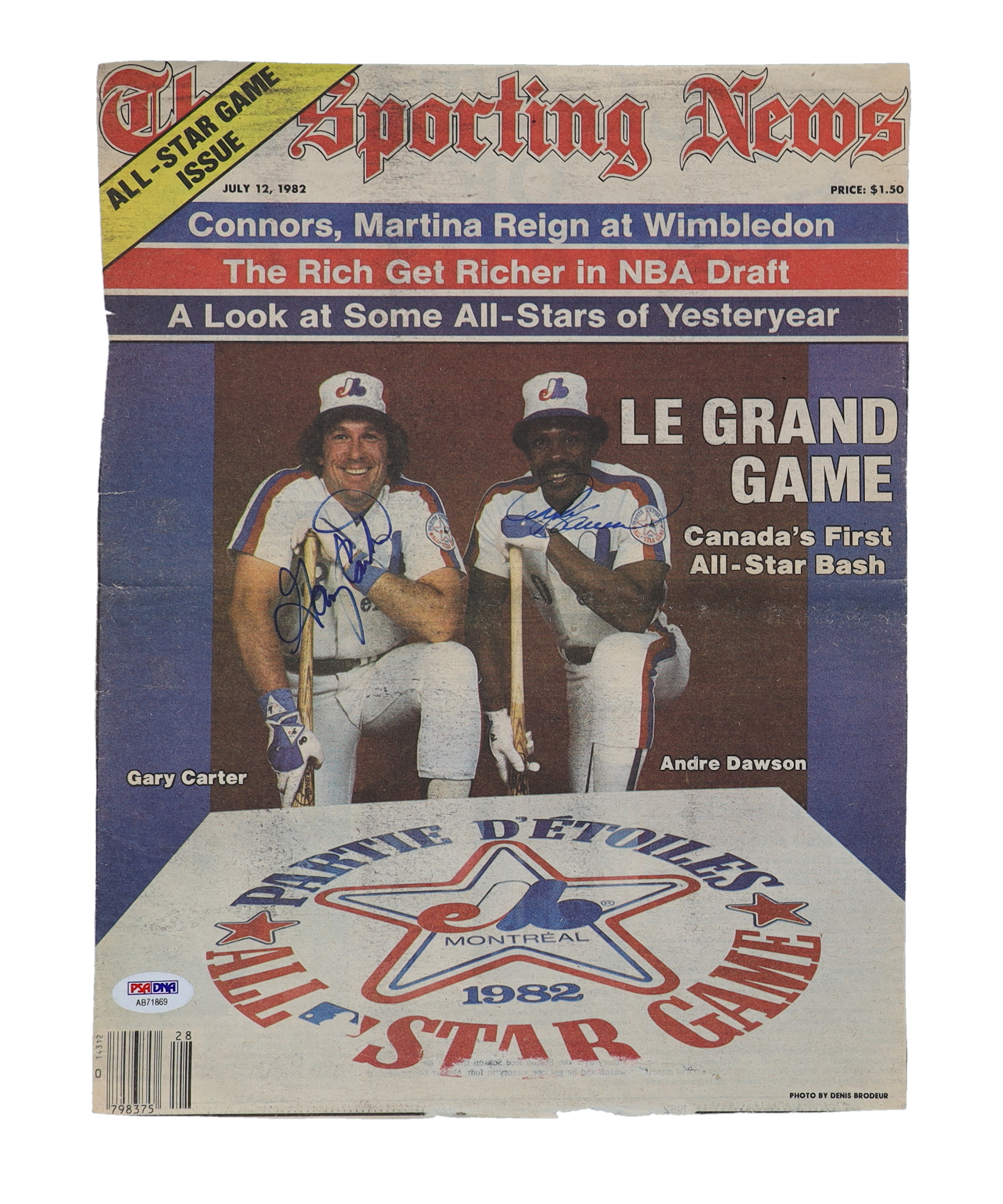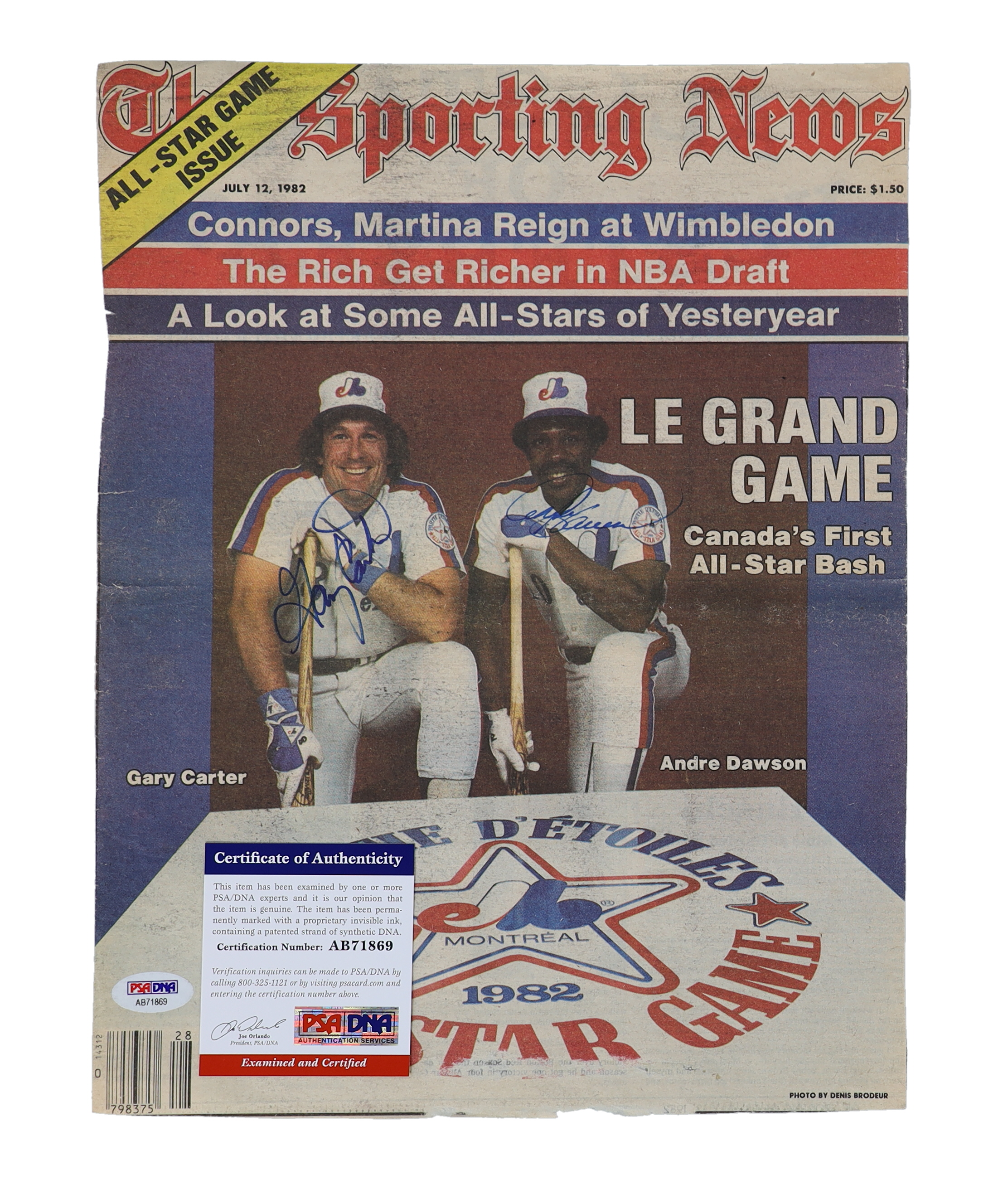 The Sporting News Newspaper Cut issue dated July 12th, 1982 has been hand-signed on the front cover by Gary Carter (D. 2012, Montreal Expos, HOF) and Andre Dawson (Montreal Expos, HOF). Please see photos for more details regarding the condition of the newspaper cut.