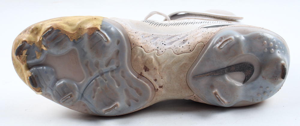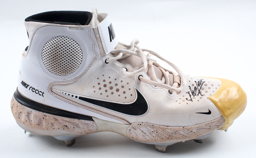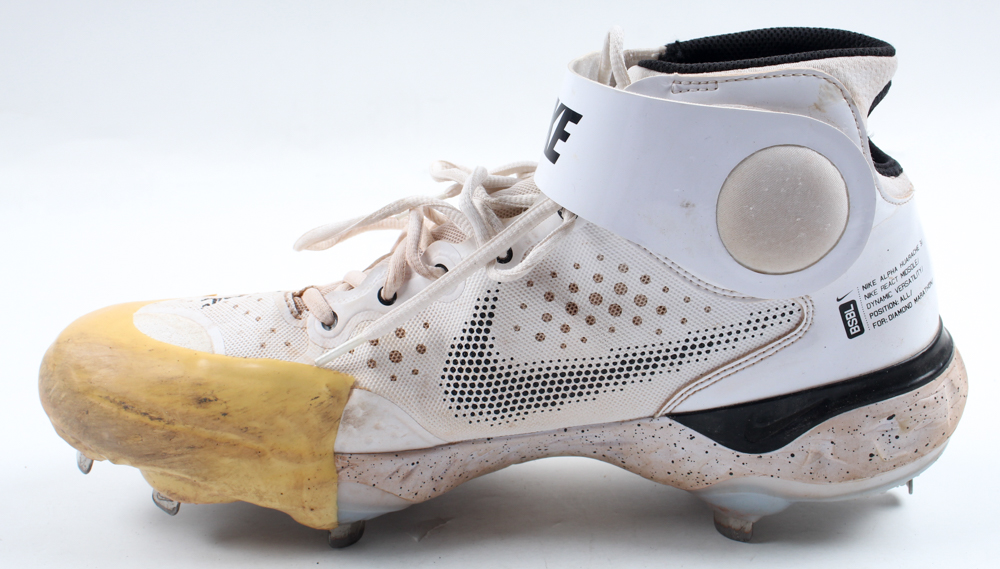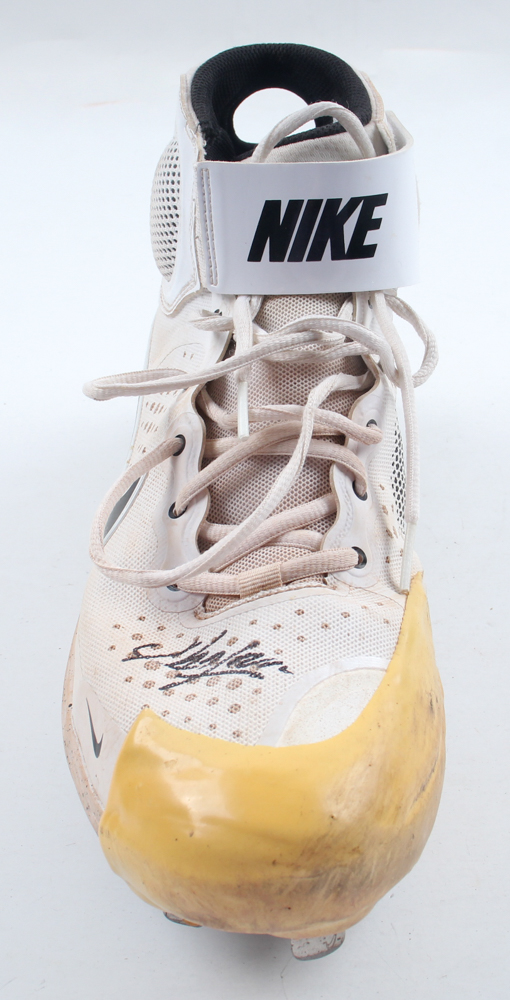 Nike baseball cleat, size 11.5. Hand-signed by Aroldis Chapman (New York Yankees). Cleat shows signs of wear. Please note, the cleat has been game-used by an unknown player.