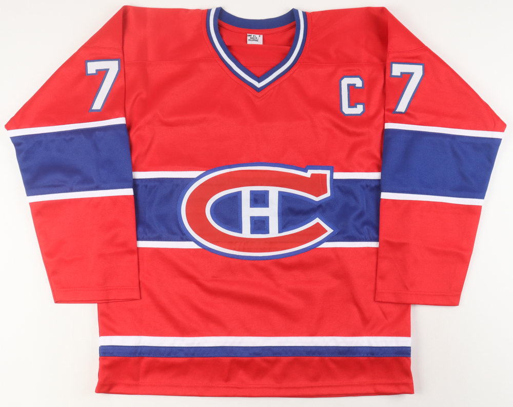 Custom jersey with everything sewn on, size XL. Hand-signed and inscribed by Pierre Turgeon (HOF).