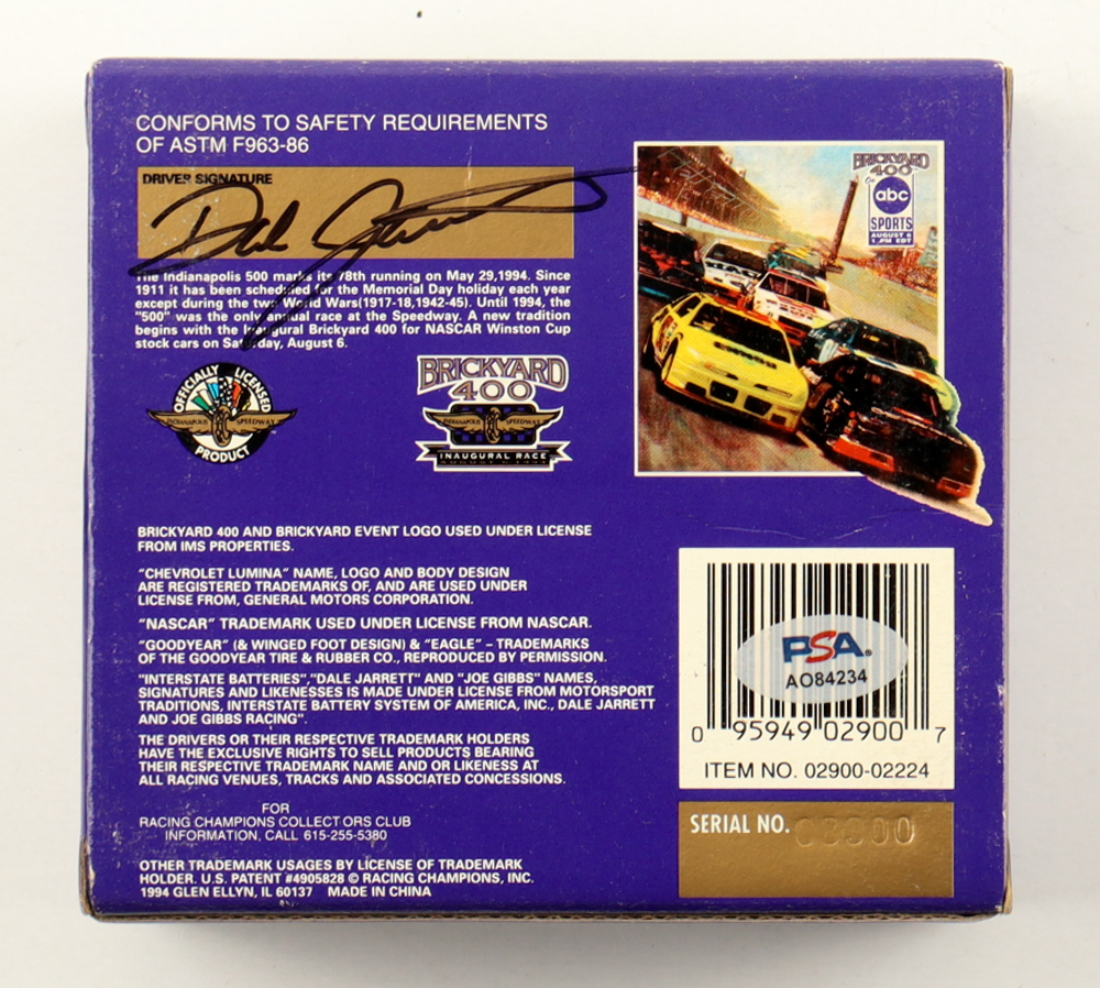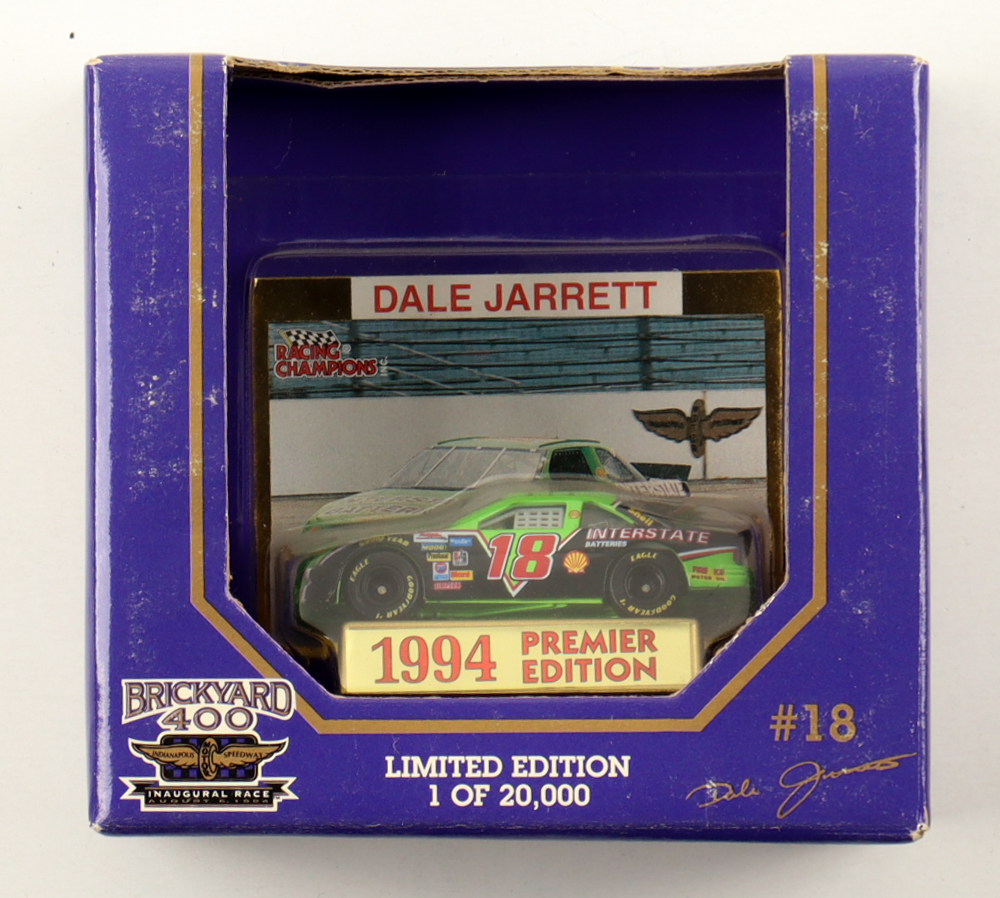 1994 Racing Champions Brickyard 400 NASCAR 1:64 scale die-cast car has been hand-signed on the front of the packaging by Dale Jarrett. Please note the signature is on the gold line at the top of the packaging, see photos for more details.
