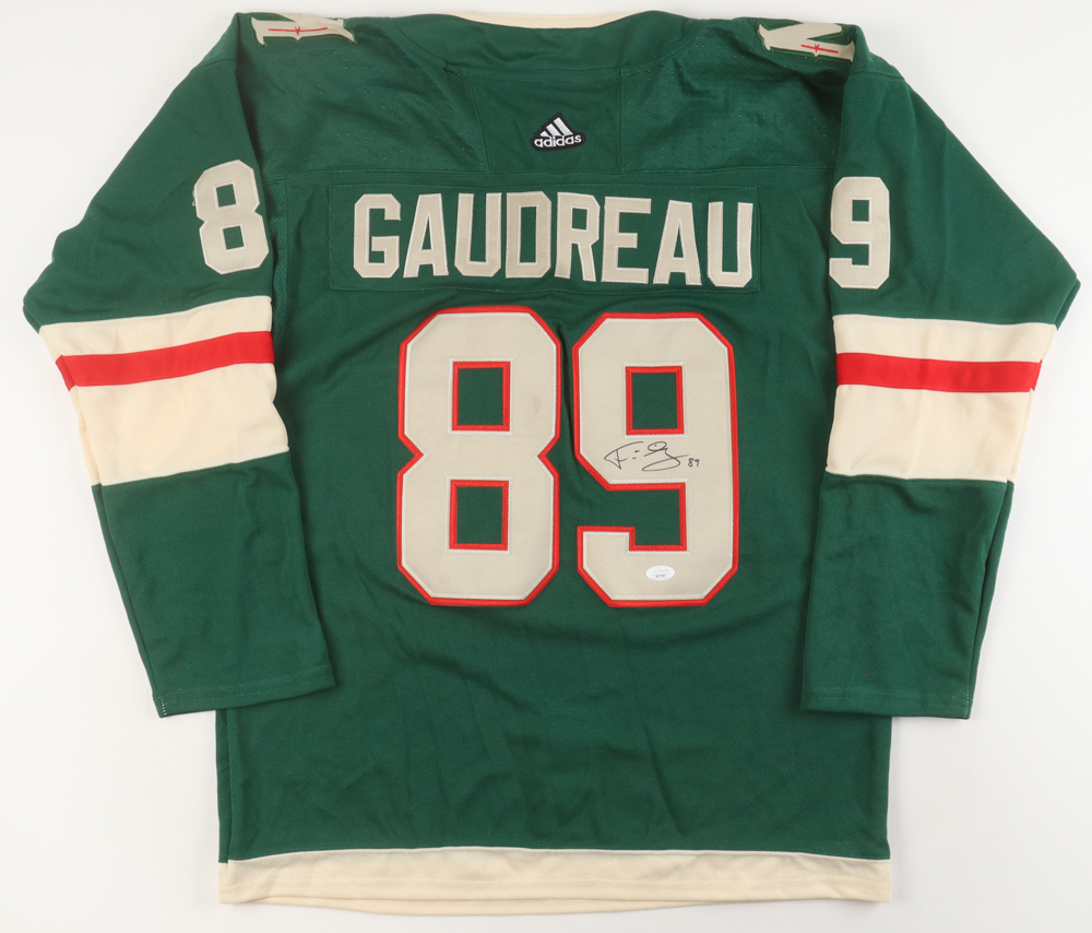 Adidas jersey with everything sewn on, size 54. Hand-signed by Frederick Gaudreau. Please note, there is staining on the reverse number.