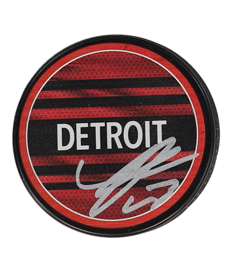 Detroit Red Wings logo hockey puck. Hand-signed by Lucas Raymond.