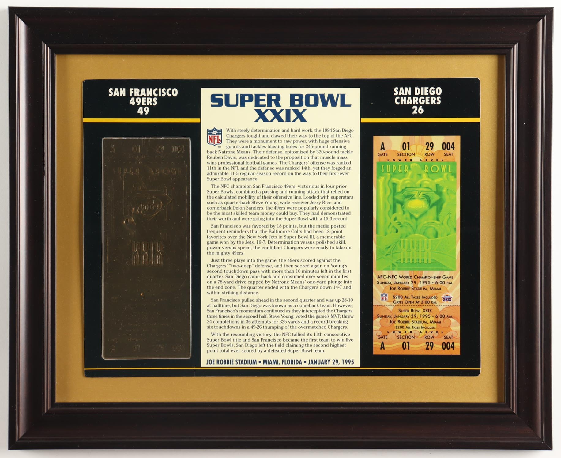Super Bowl XXIX Commemorative Custom Framed Score Card Display with 23KT Gold Ticket