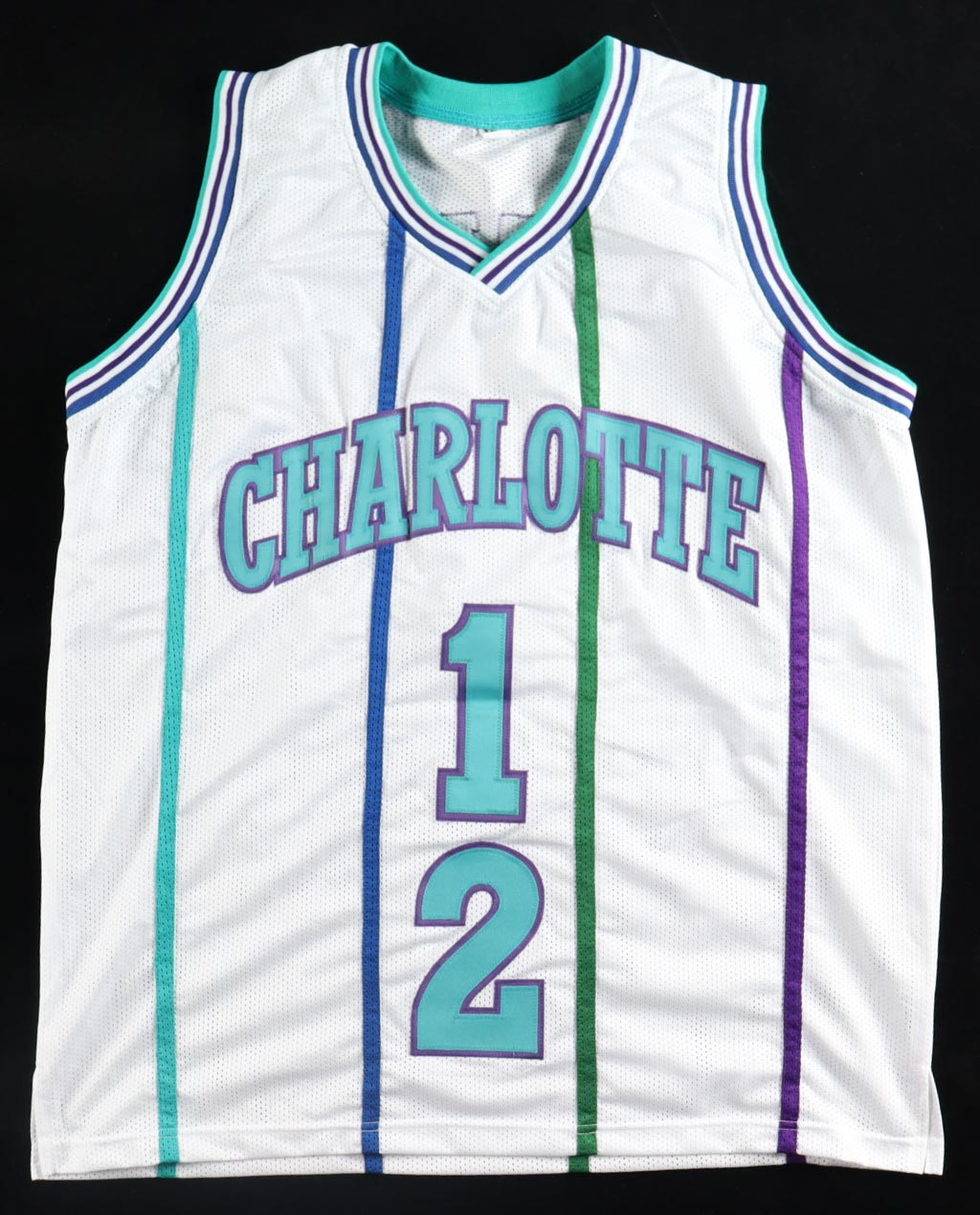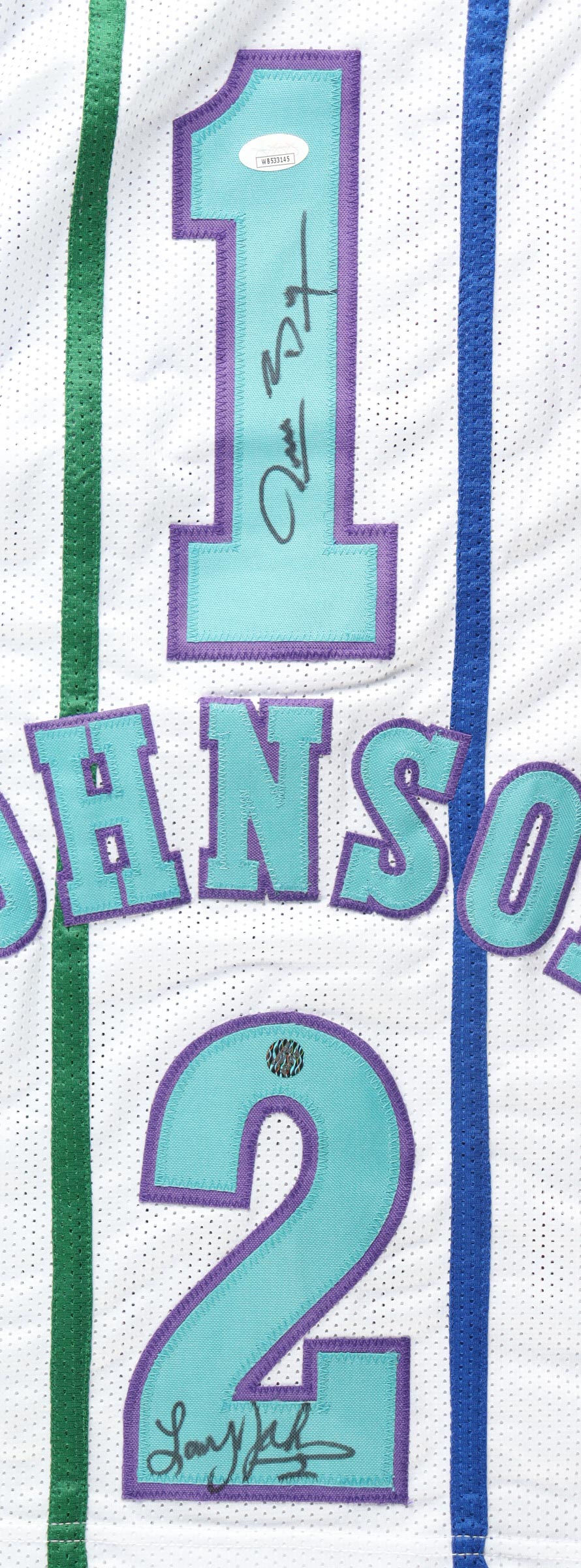Custom jersey with everything sewn on, size XL. Hand-signed by Muggsy Bogues and Larry Johnson.