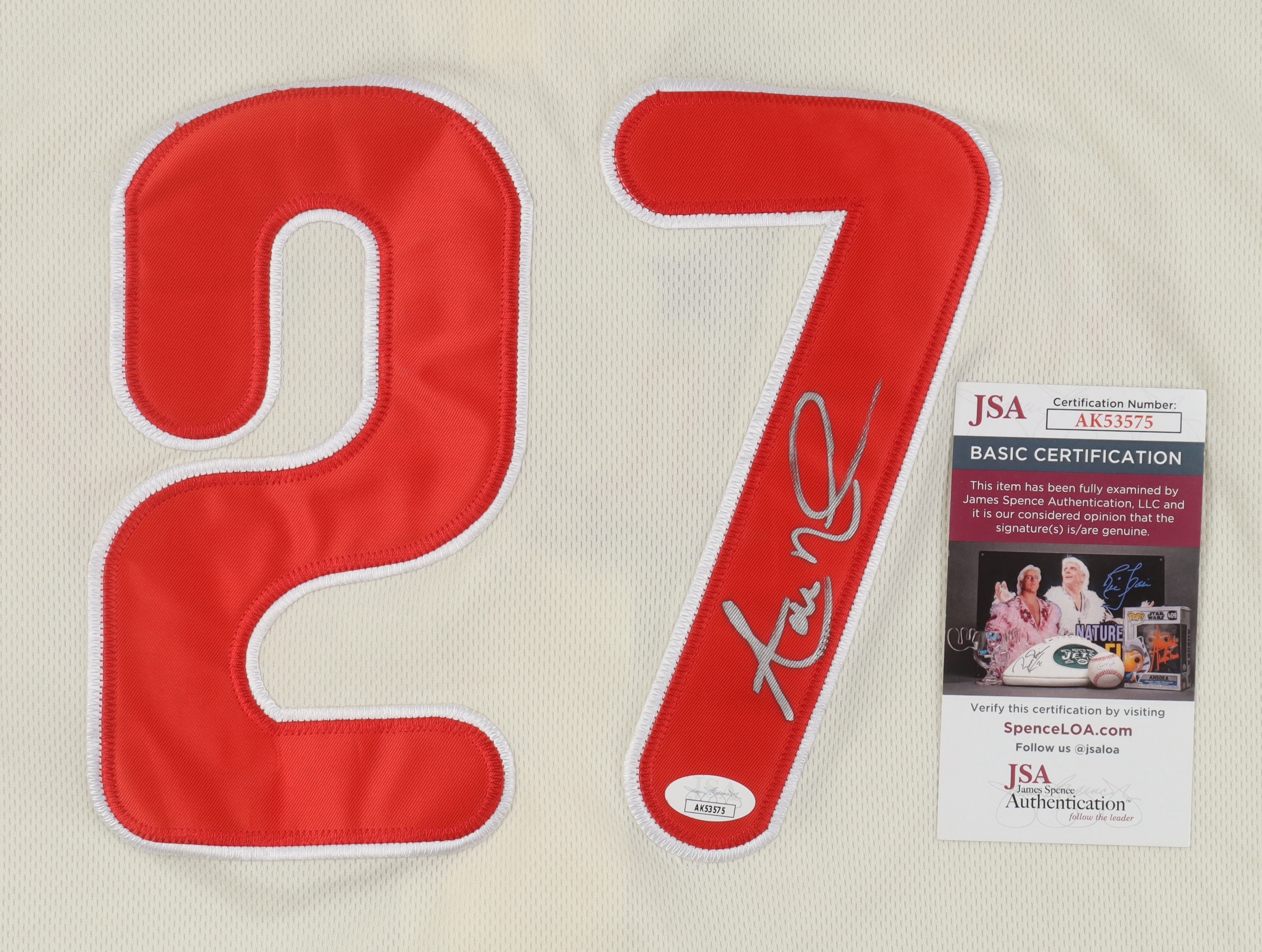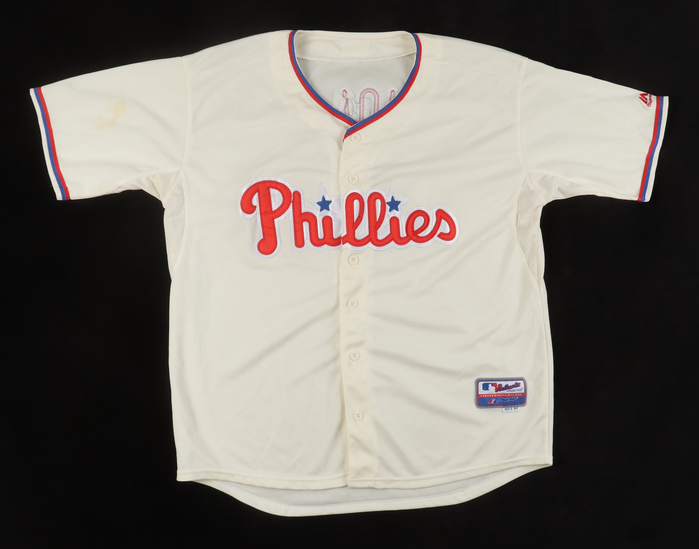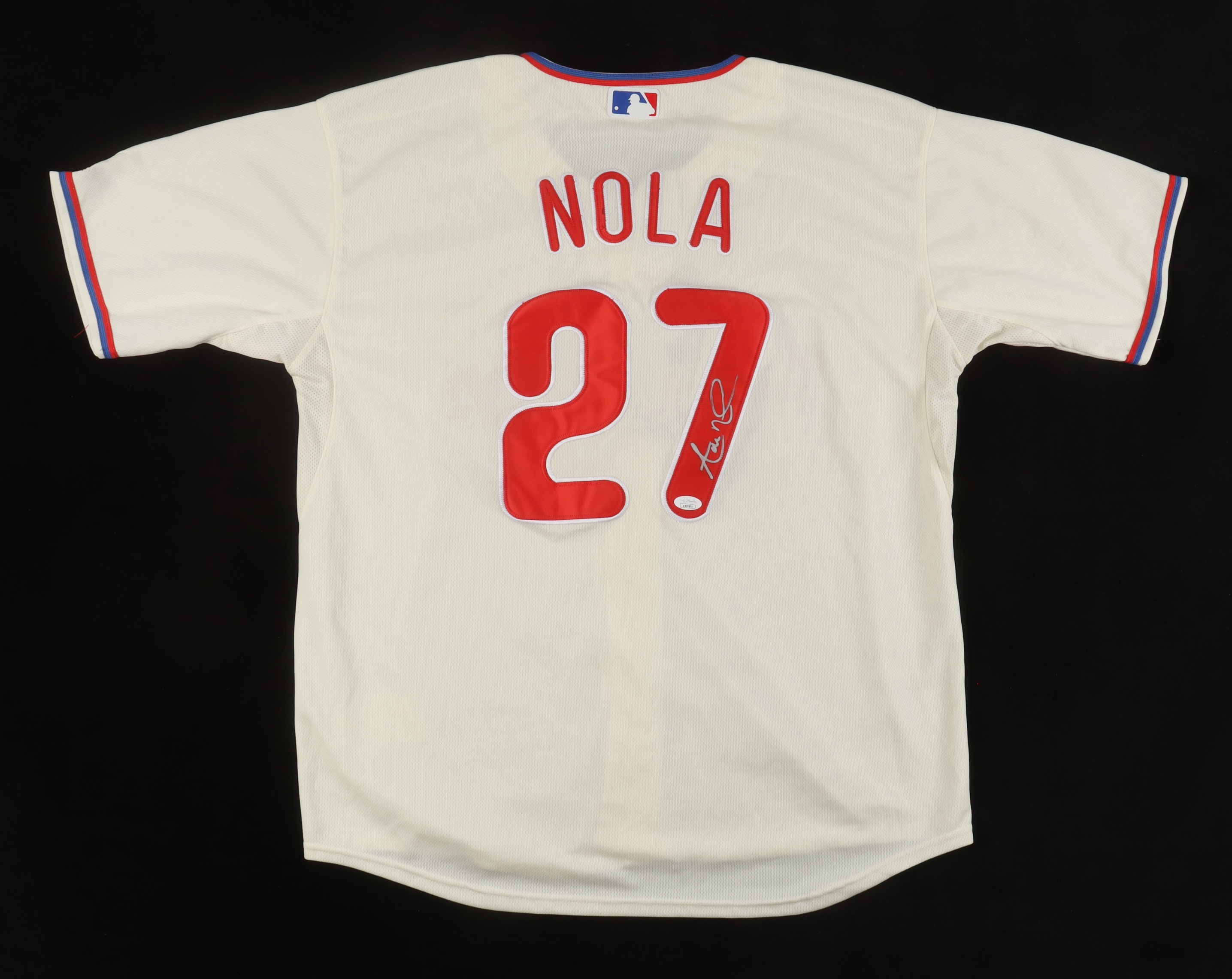 Majestic jersey. Everything sewn on, size 52. Hand-signed by Aaron Nola. Please note, there is staining on the right sleeve. See photos regarding the condition of the item.
