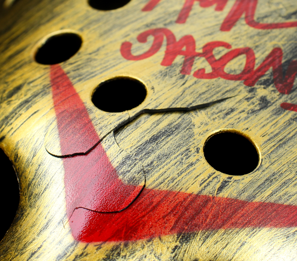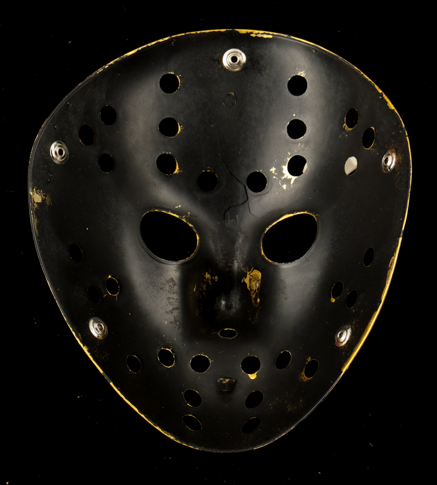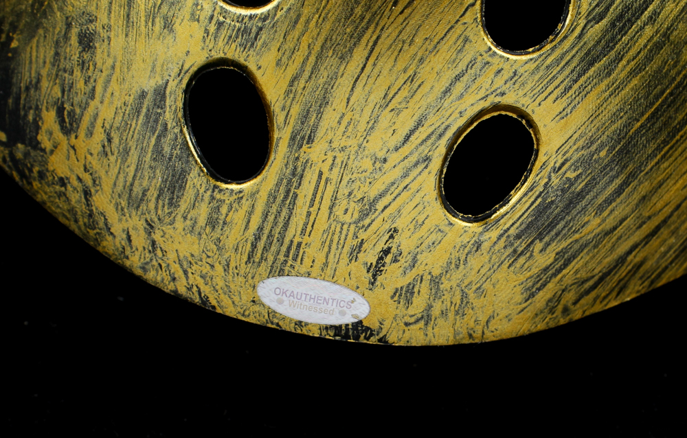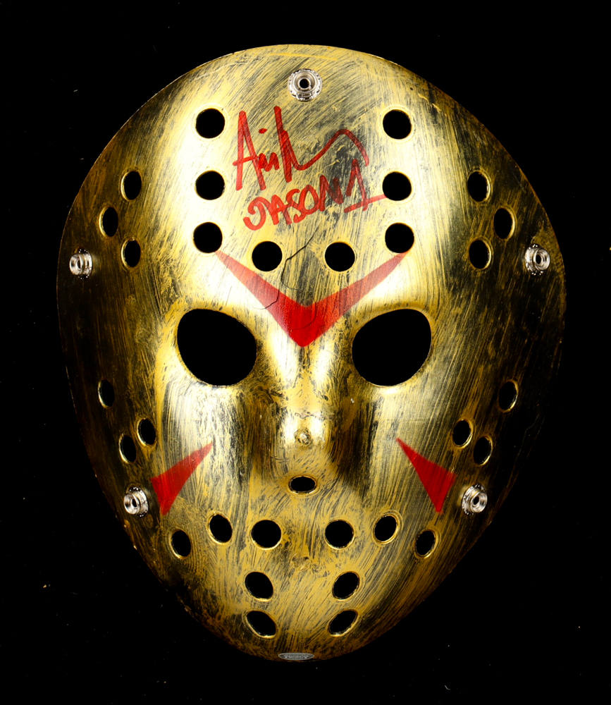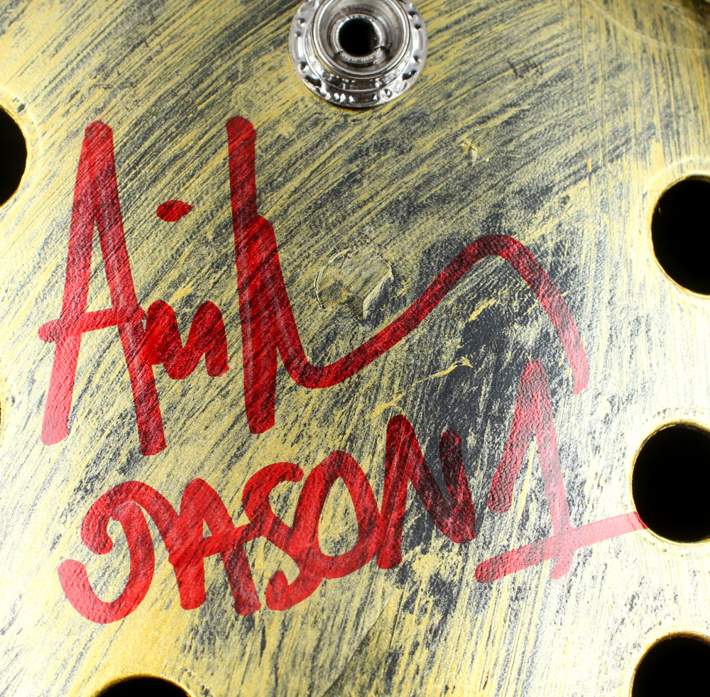 Custom "Friday the 13th" Jason Voorhees full-size replica mask. Hand-signed and inscribed by Ari Lehman (Jason Voorhees). Please note, the mask is cracked below the inscription.