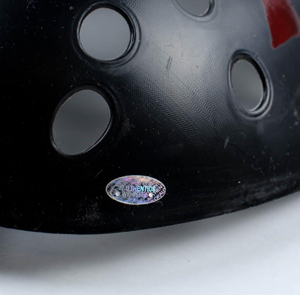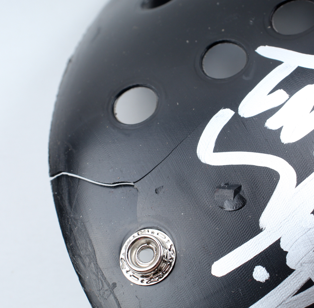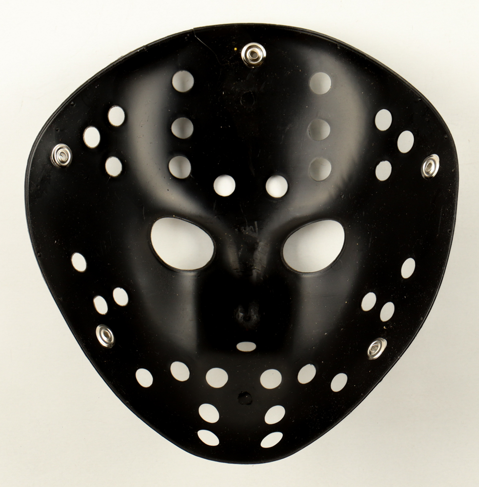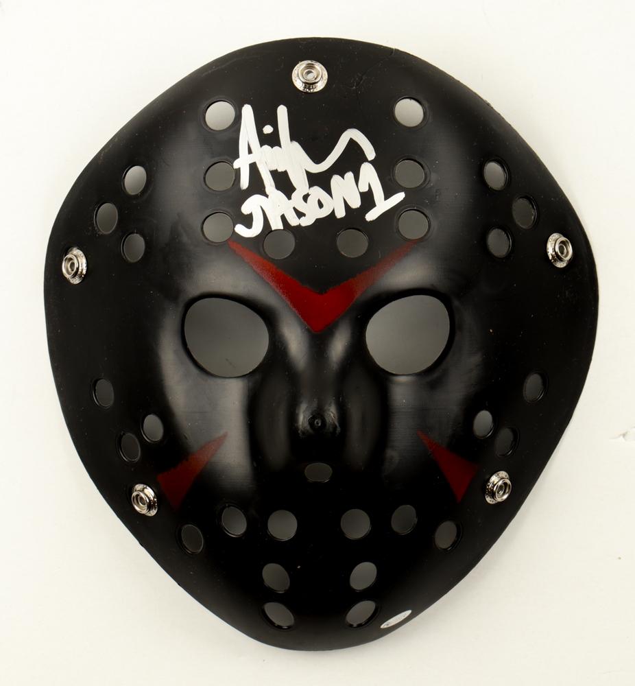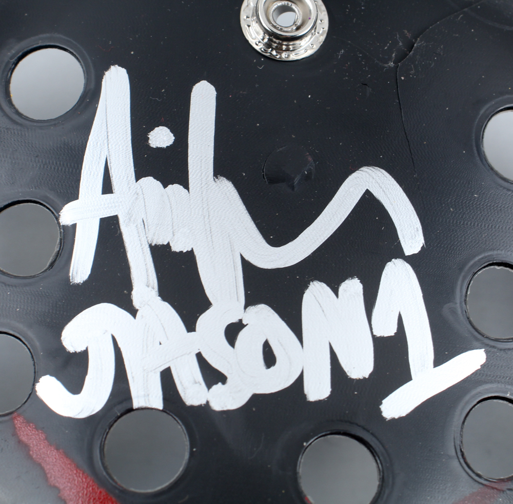 Custom "Friday the 13th" Jason Voorhees full-size replica mask. Hand-signed and inscribed by Ari Lehman (Jason Voorhees). Please note, the mask is cracked on the top center edge.