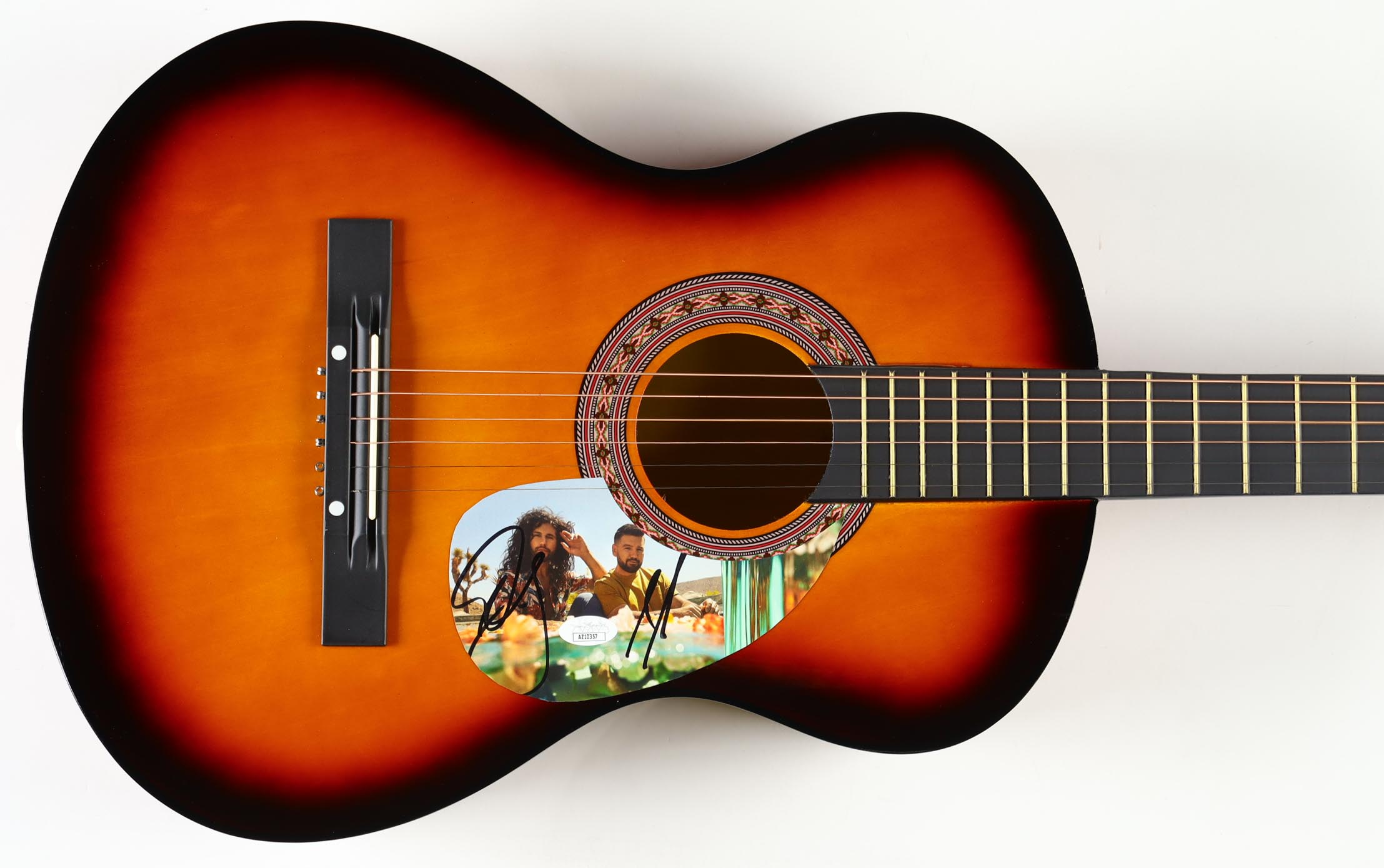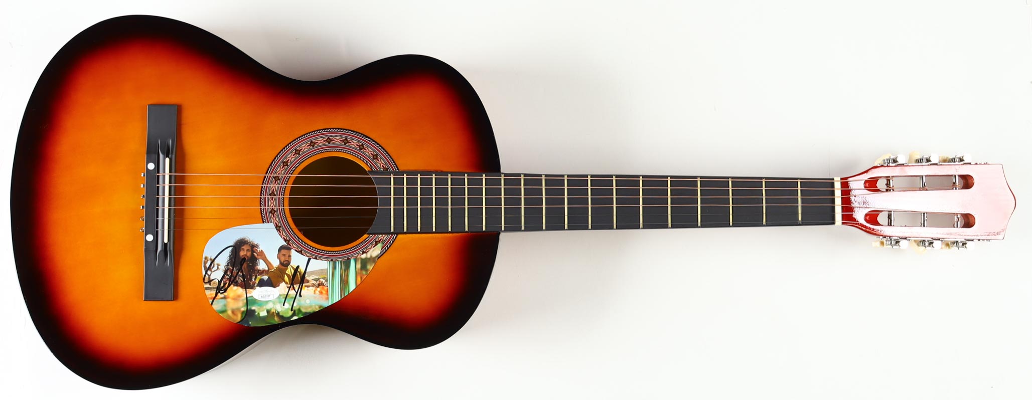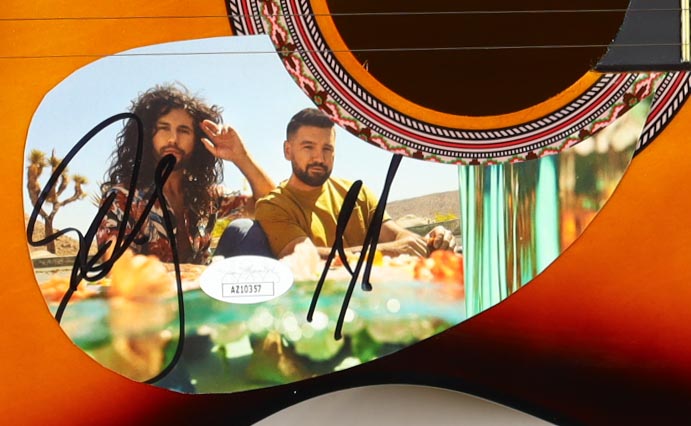 Acoustic guitar measures approximately 38" in length and has been hand-signed on a cut that has been repurposed as a pick-guard by Dan Smyers and Shay Mooney.