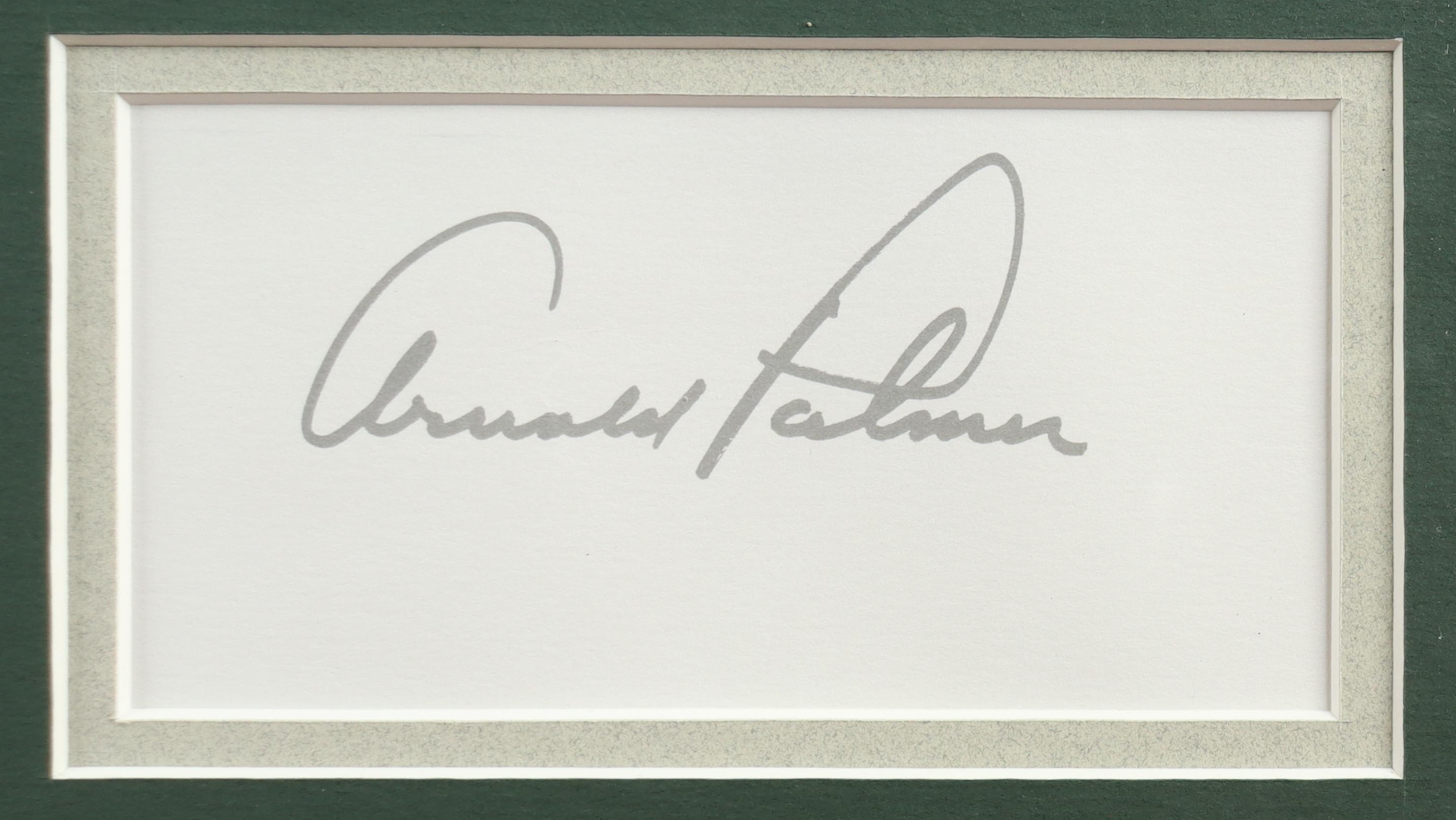 Custom frame measures 27” x 30” in size and features a cut that have been hand-signed by Arnold Palmer (D. 2016, HOF). Please note the other signature is on the display is facsimile.