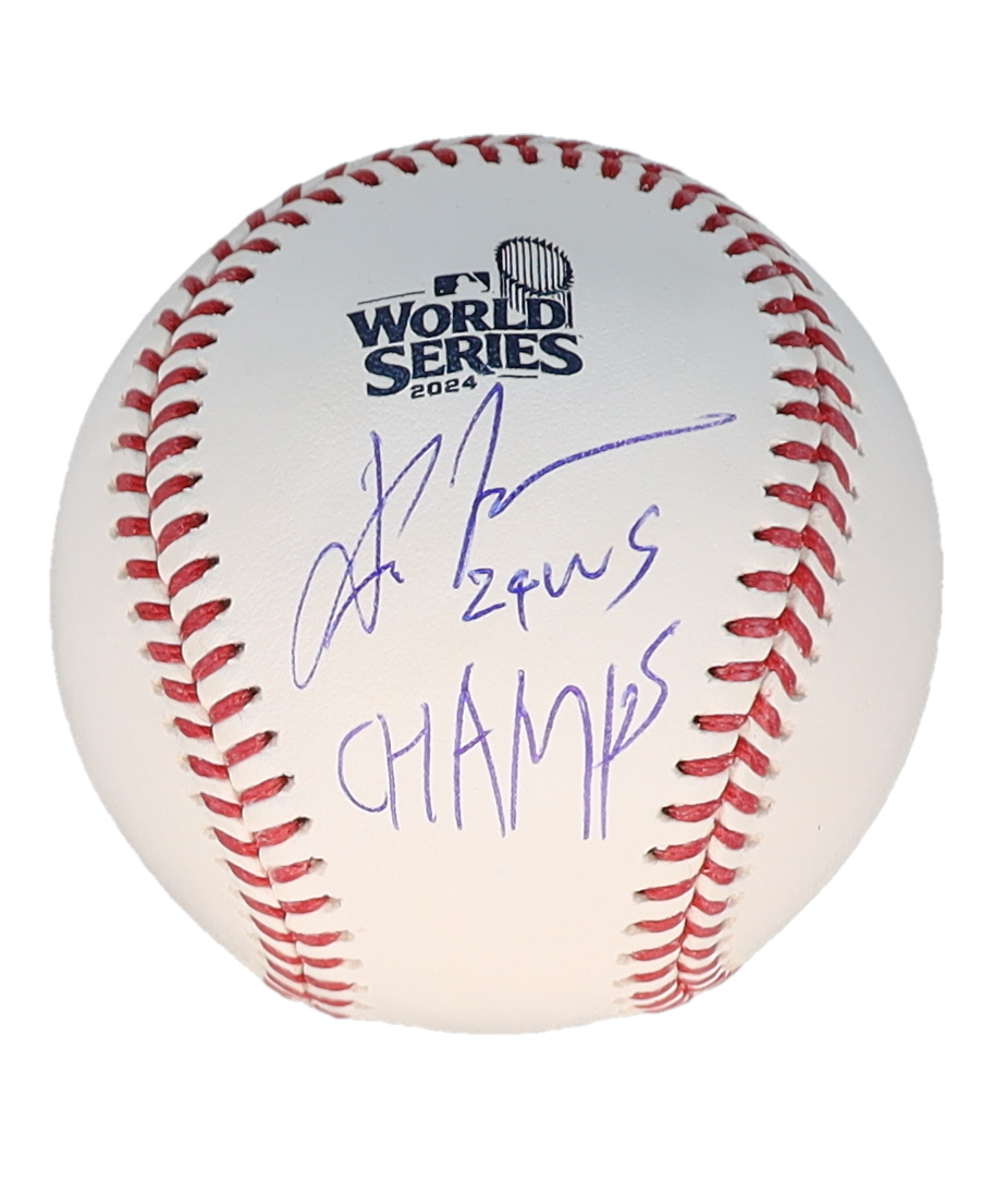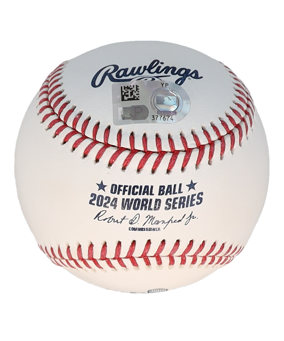Rawlings Official 2024 World Series Logo baseball has been hand-signed and inscribed by Yoshinobu Yamamoto (Los Angeles Dodgers).