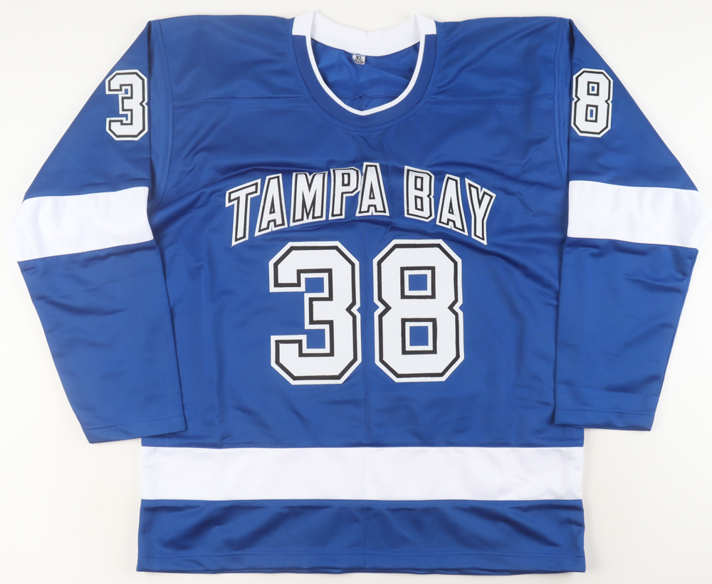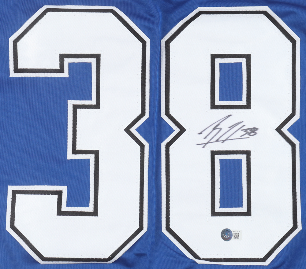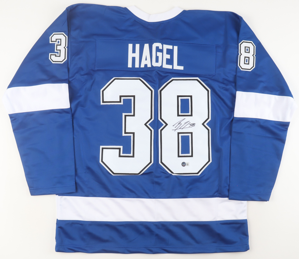 Custom jersey. Everything sewn on, size XL. Hand-signed by Brandon Hagel. Please note, the signature has bled.